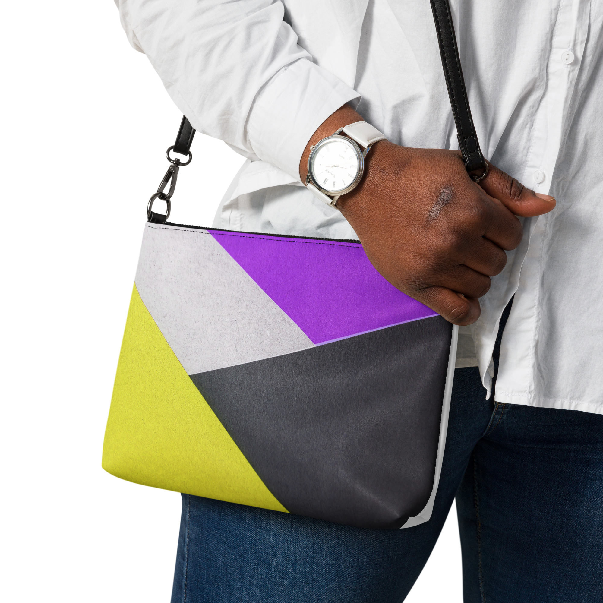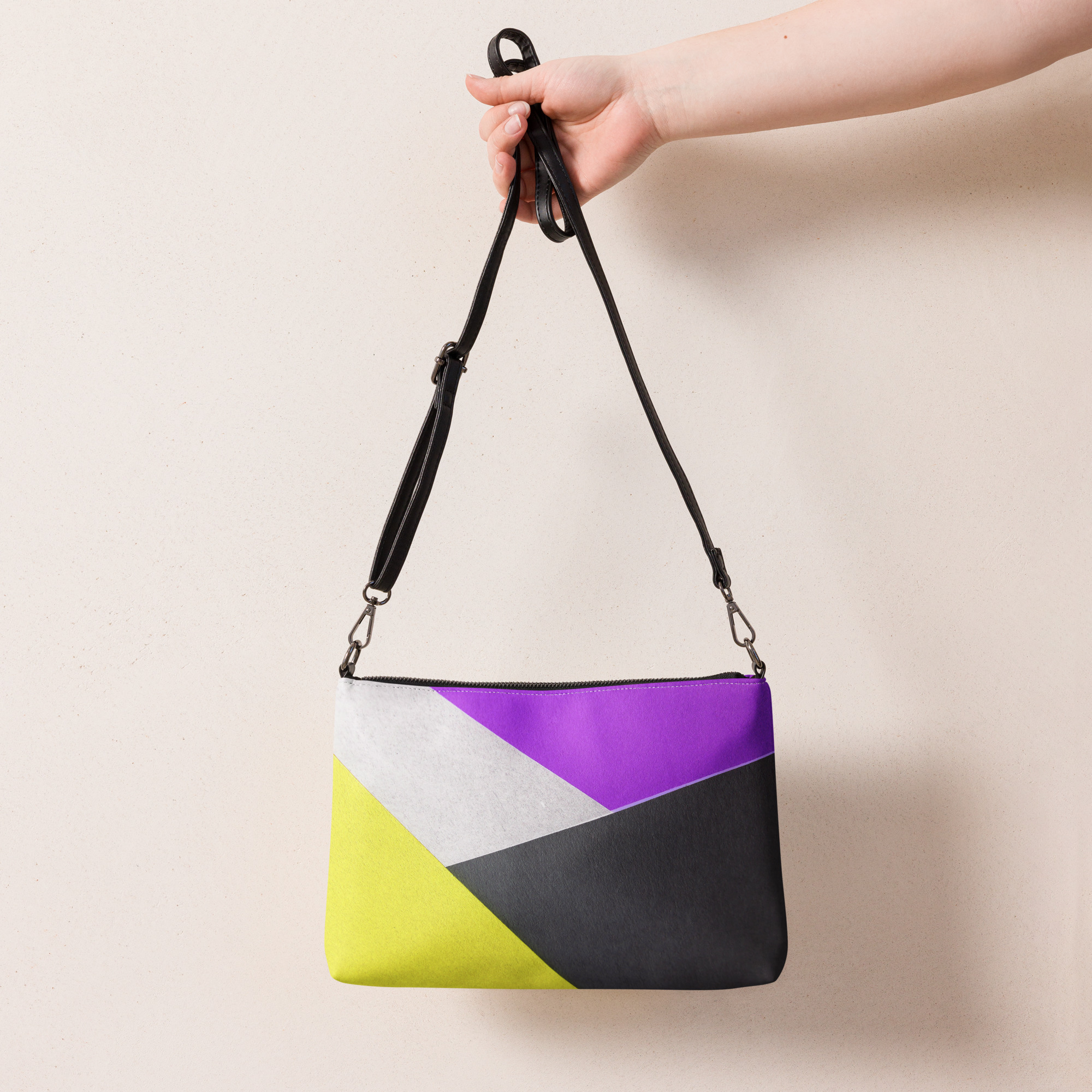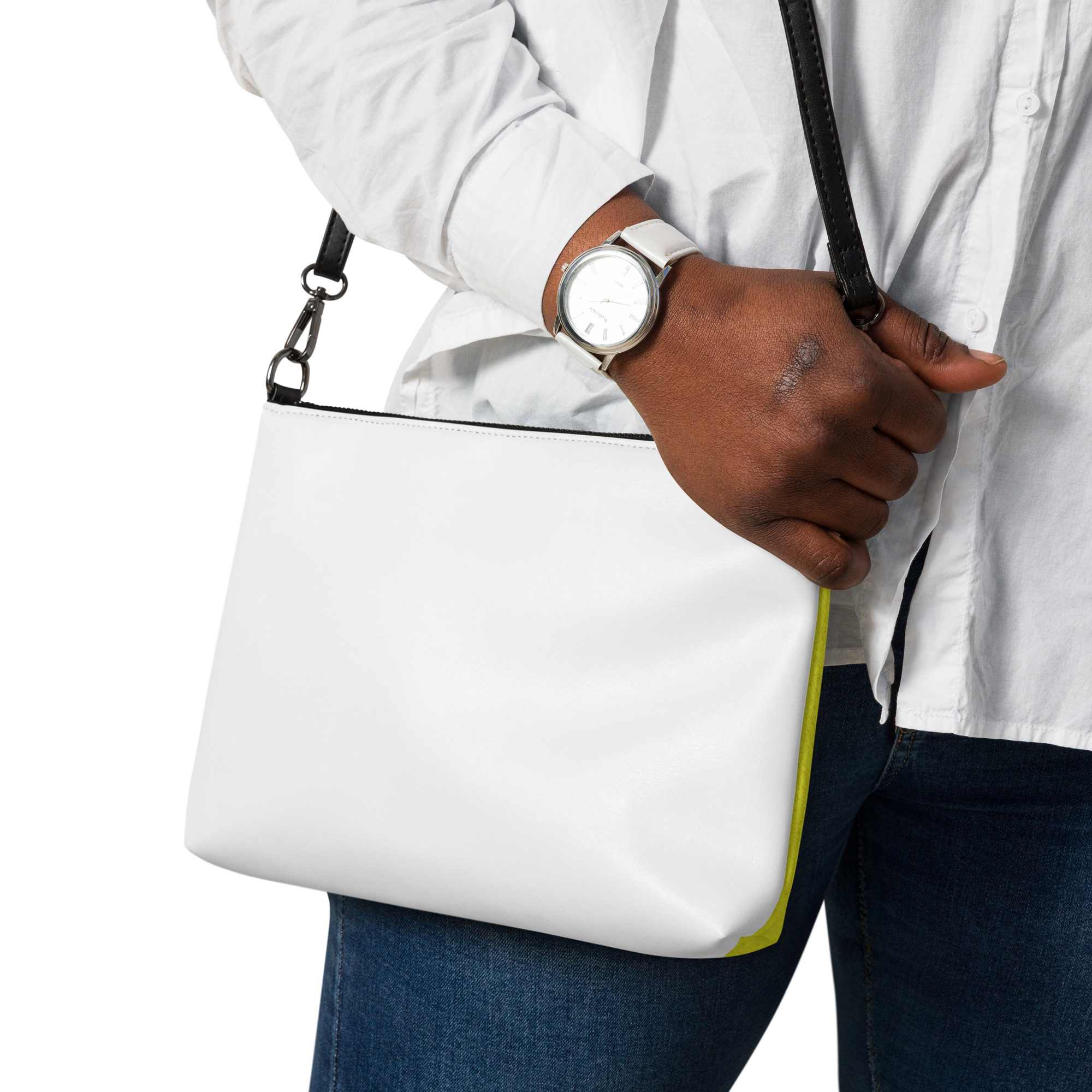 Mantenha seu estilo no ponto e suas mãos livres com nossa bolsa transversal versátil. Ela é feita de couro sintético premium e metais cinza escuro. Graças ao fechamento com zíper e vários bolsos internos, você pode manter seus itens essenciais seguros e organizados. Transforme esta bolsa transversal com alças removíveis de pulso e ombro para usá-la para looks do dia a noite.