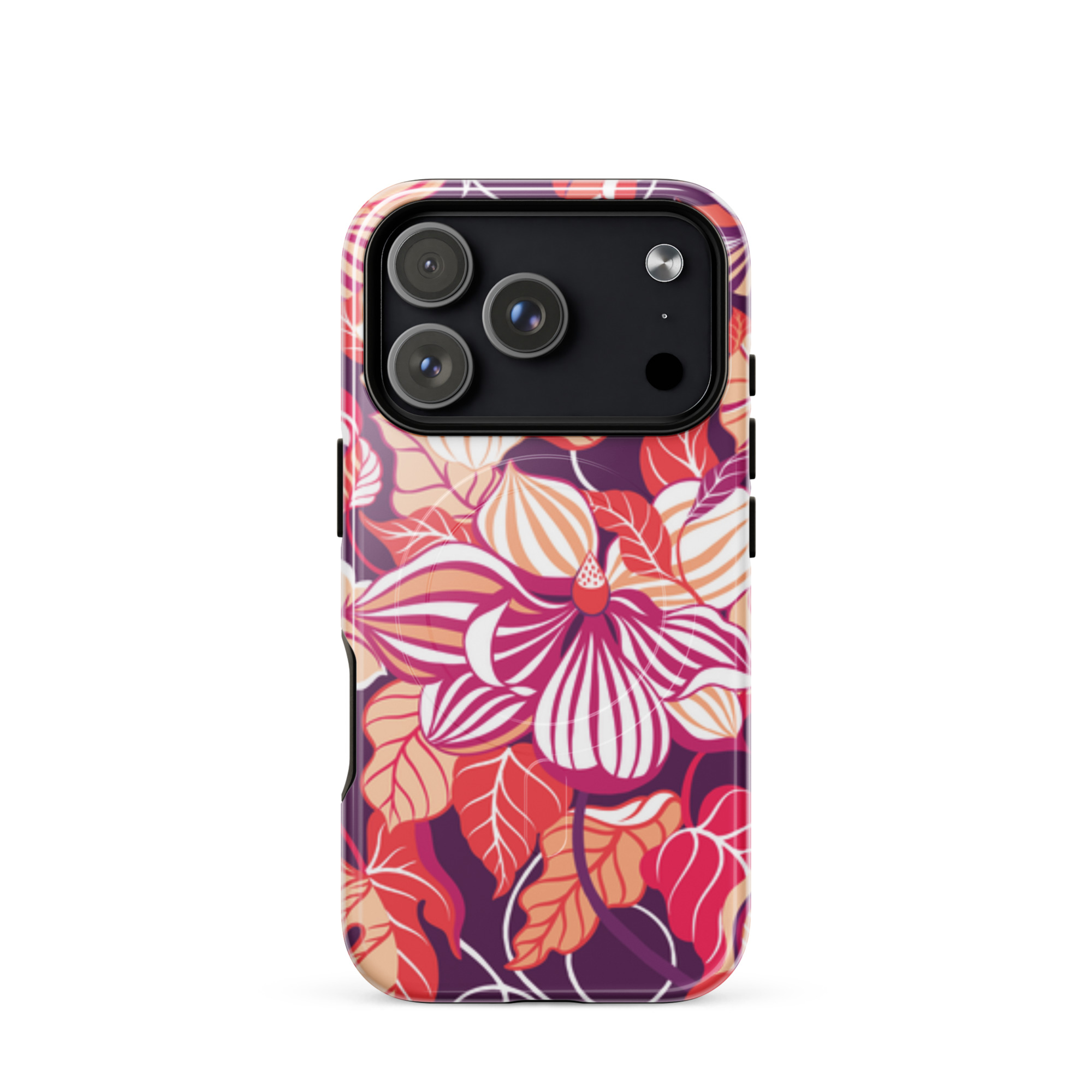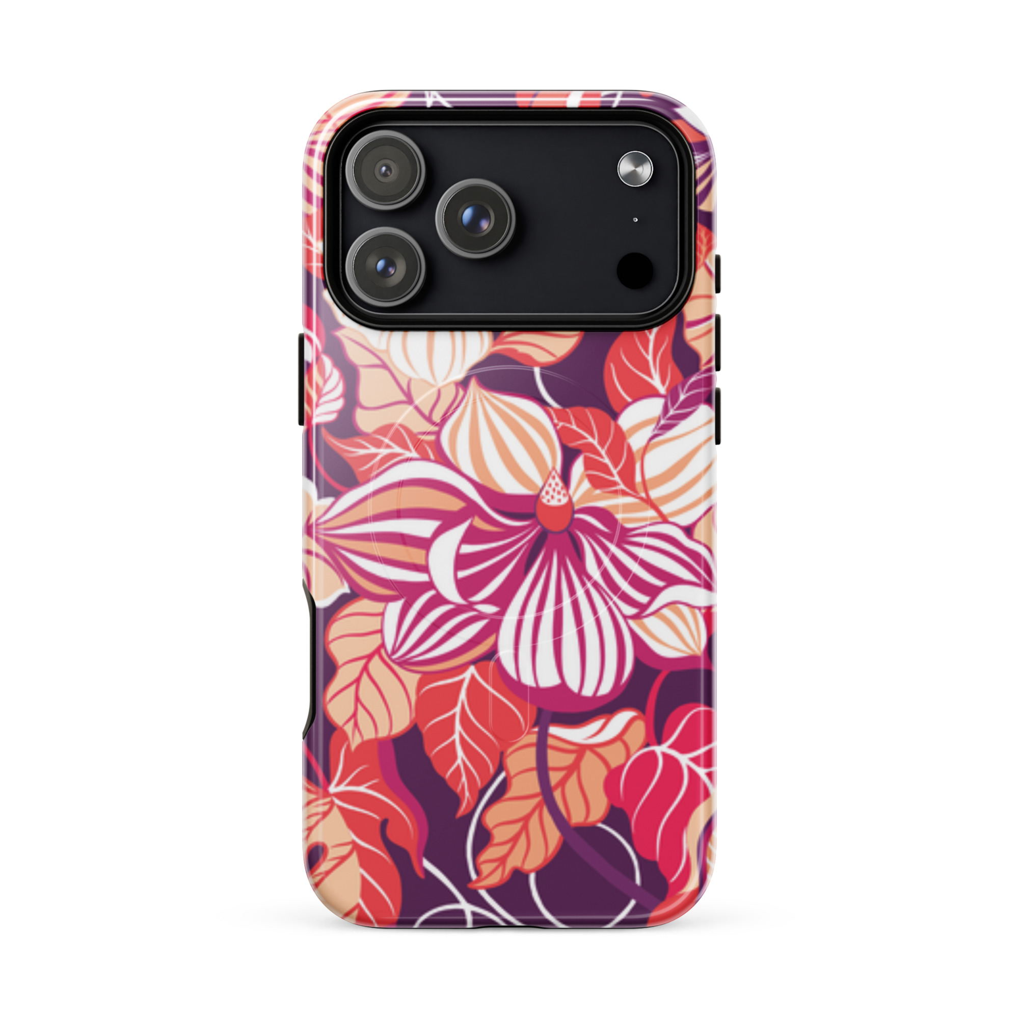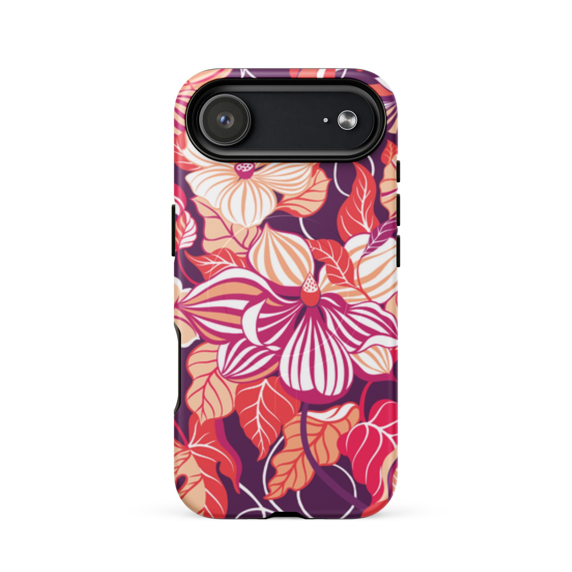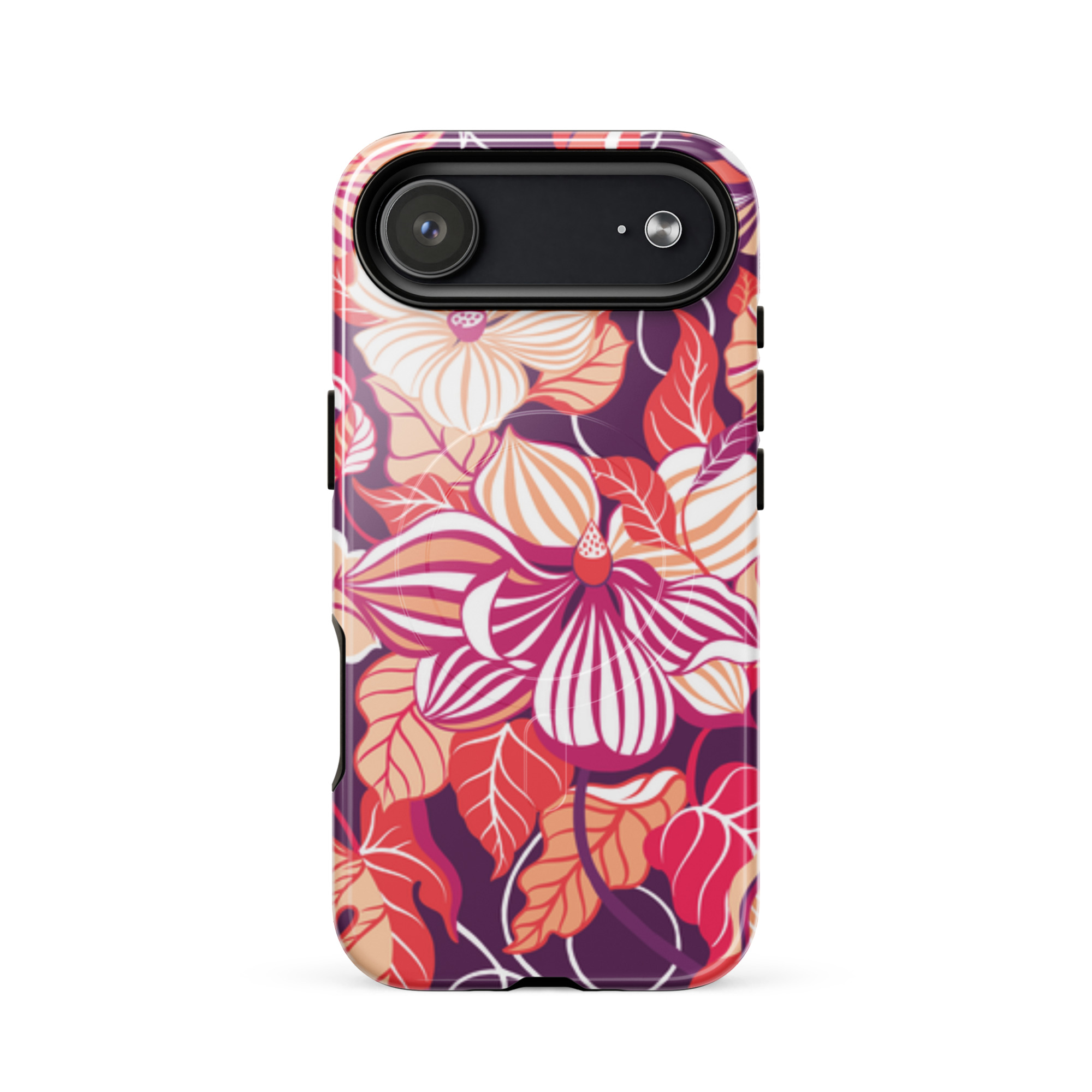 Capa para iPhone® MagSafe® - flores grandes e estilizadas em tons de vermelho, laranja, rosa e branco.
