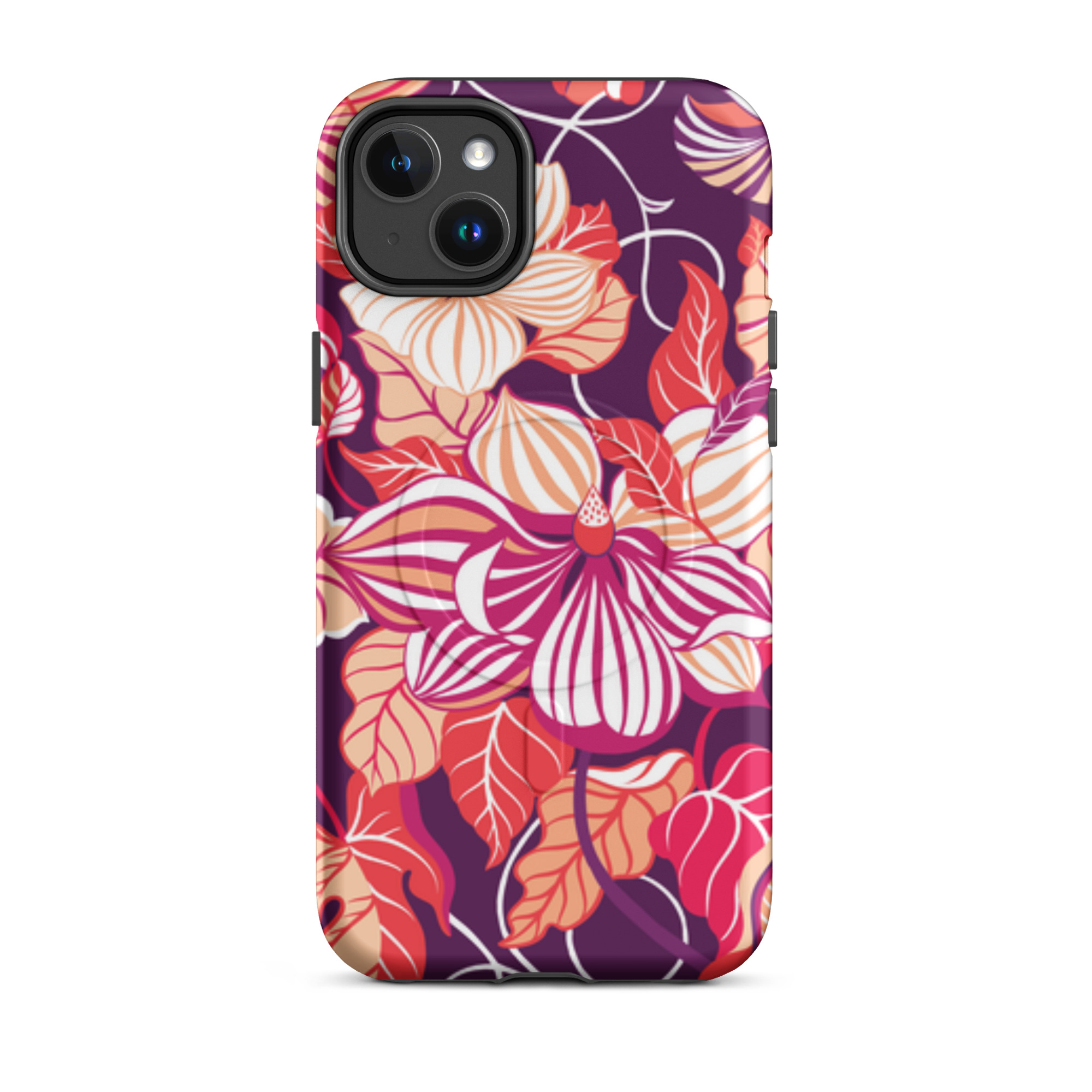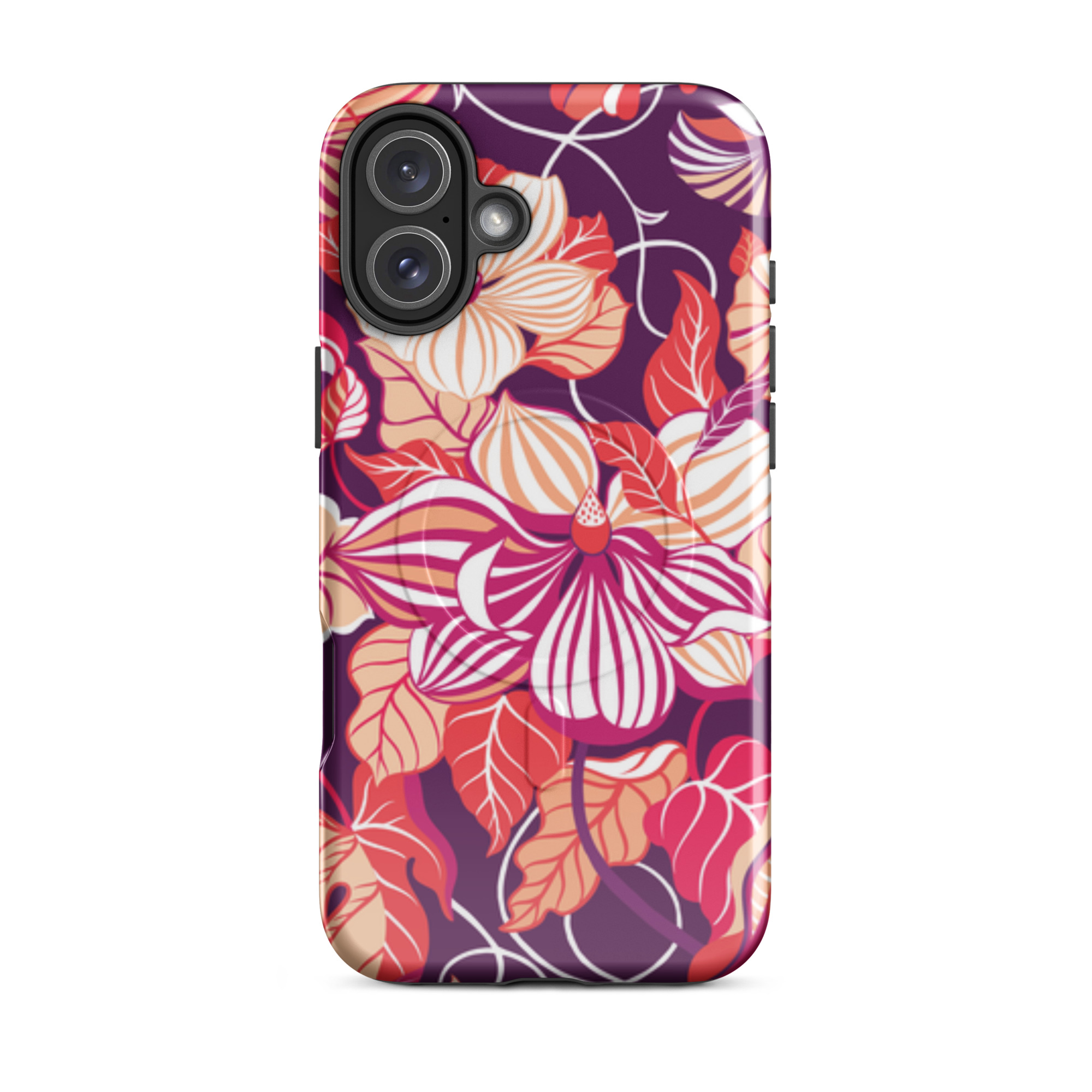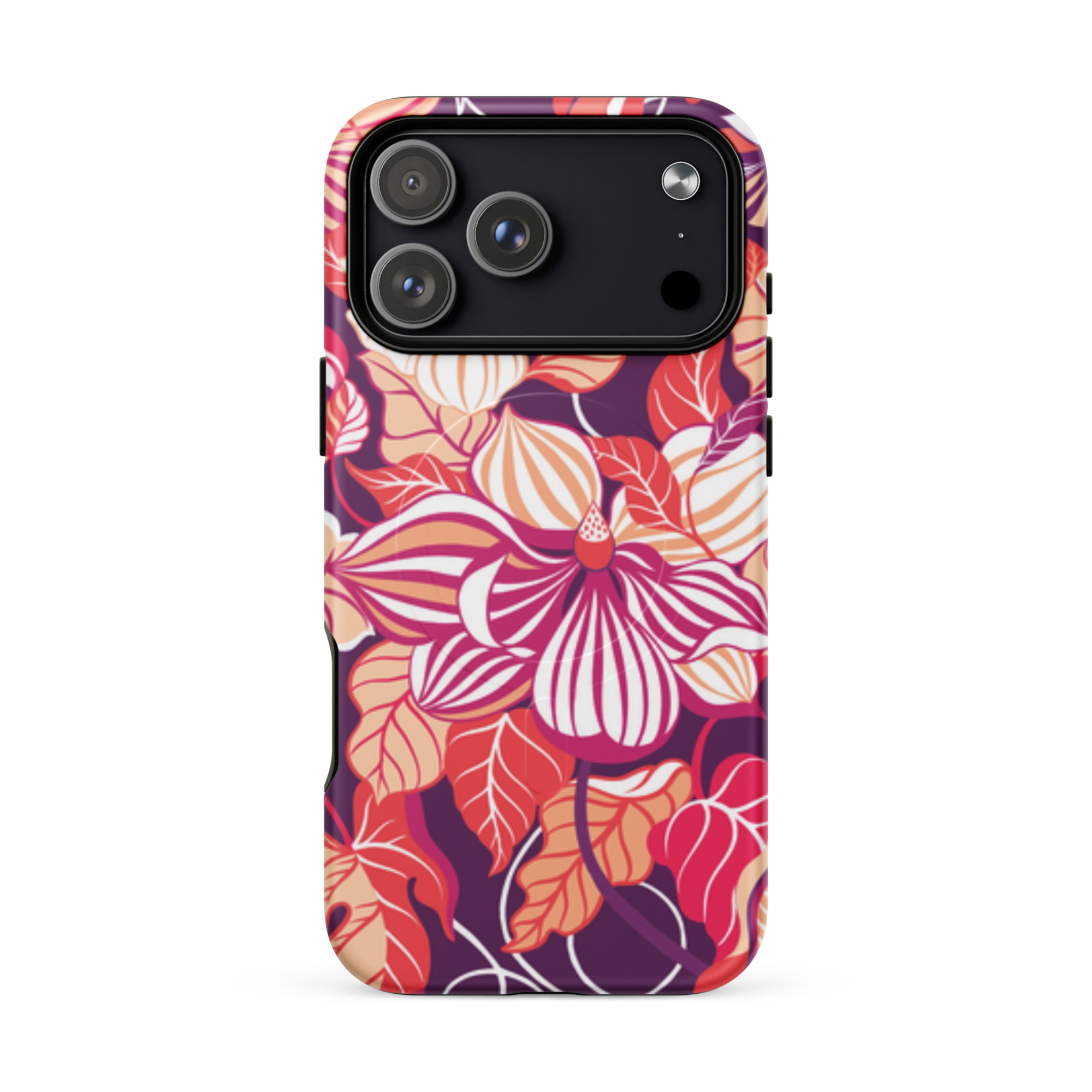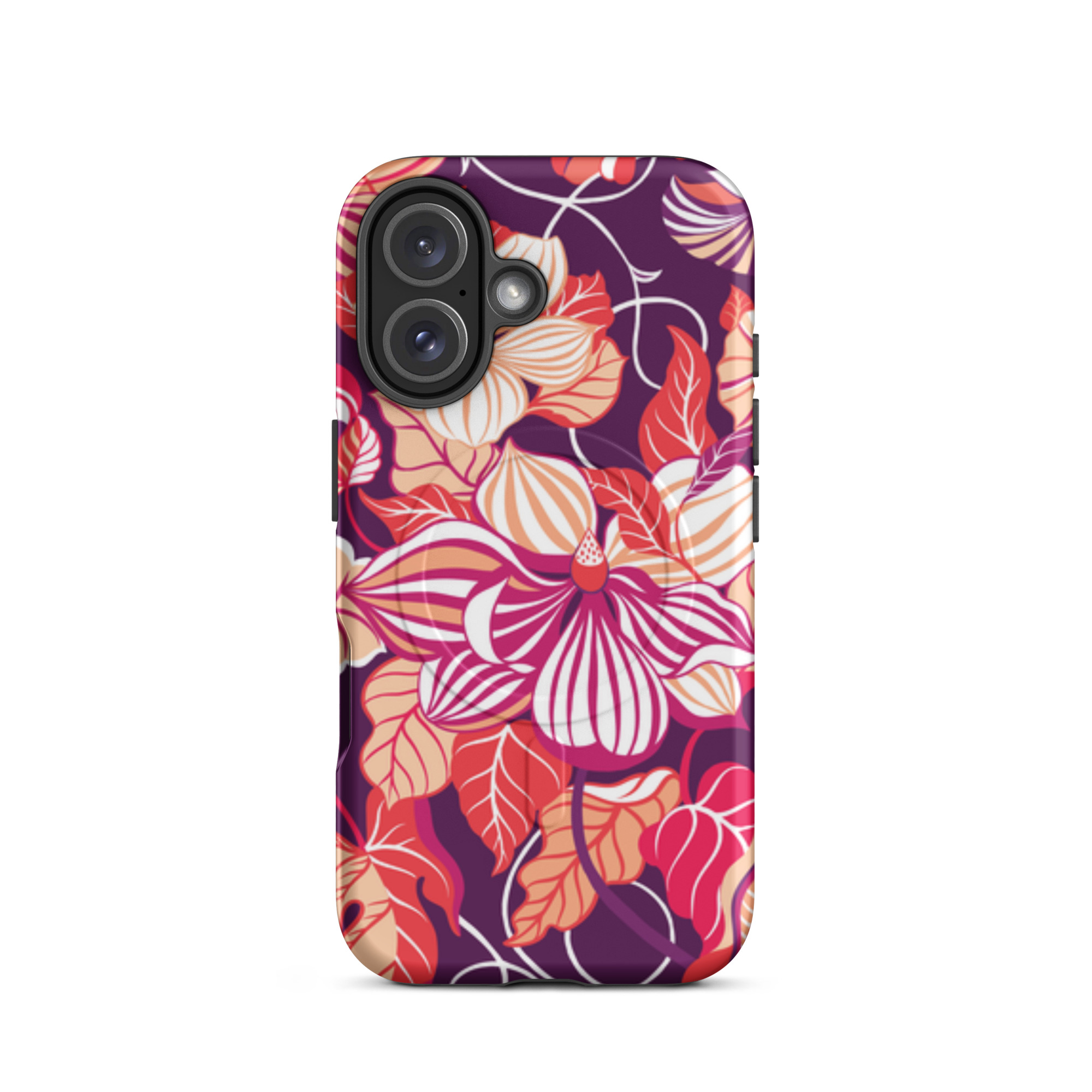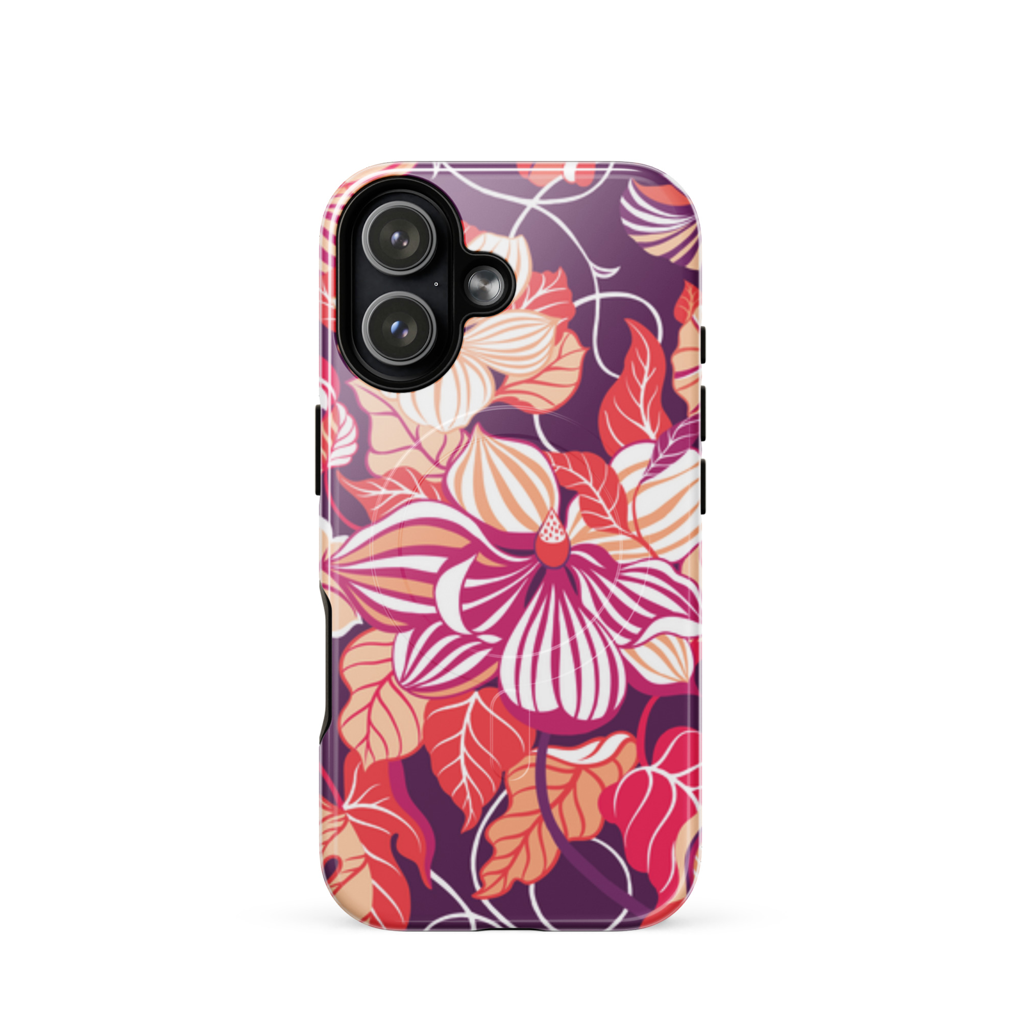 Capa para iPhone® MagSafe® - flores grandes e estilizadas em tons de vermelho, laranja, rosa e branco.