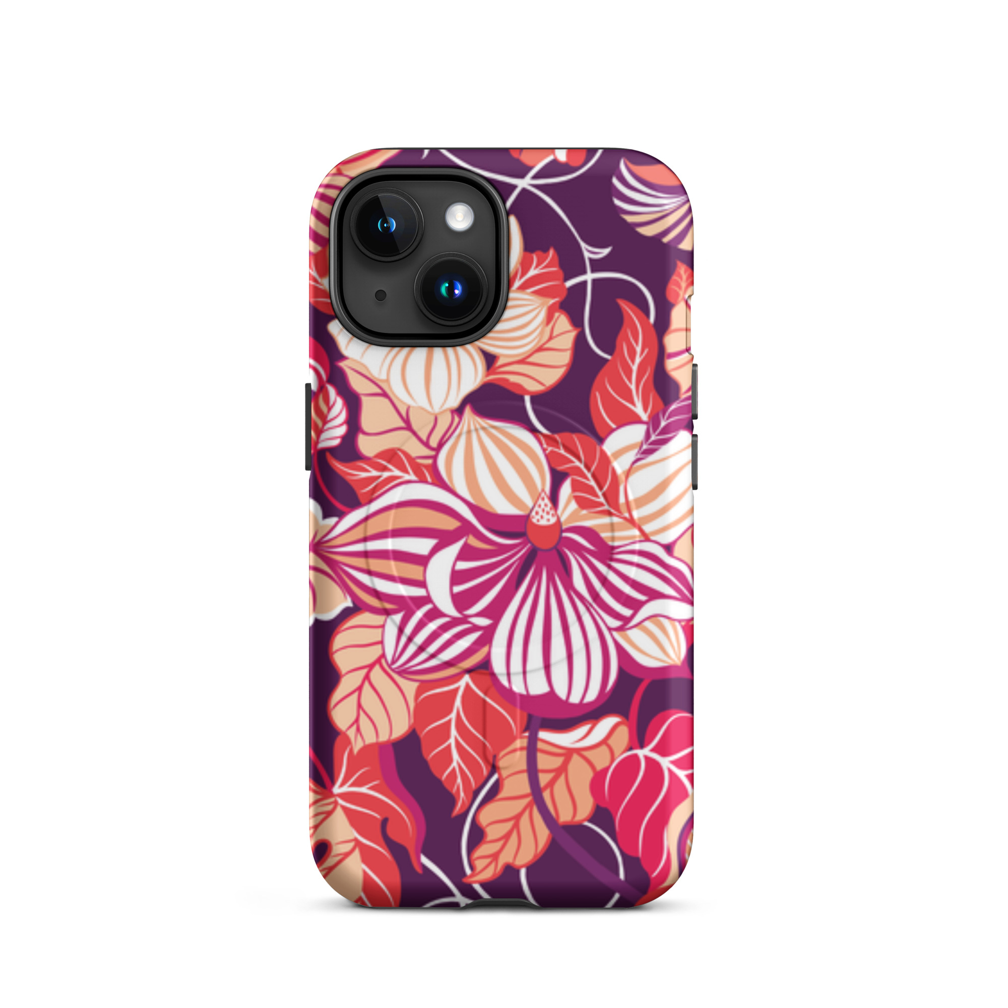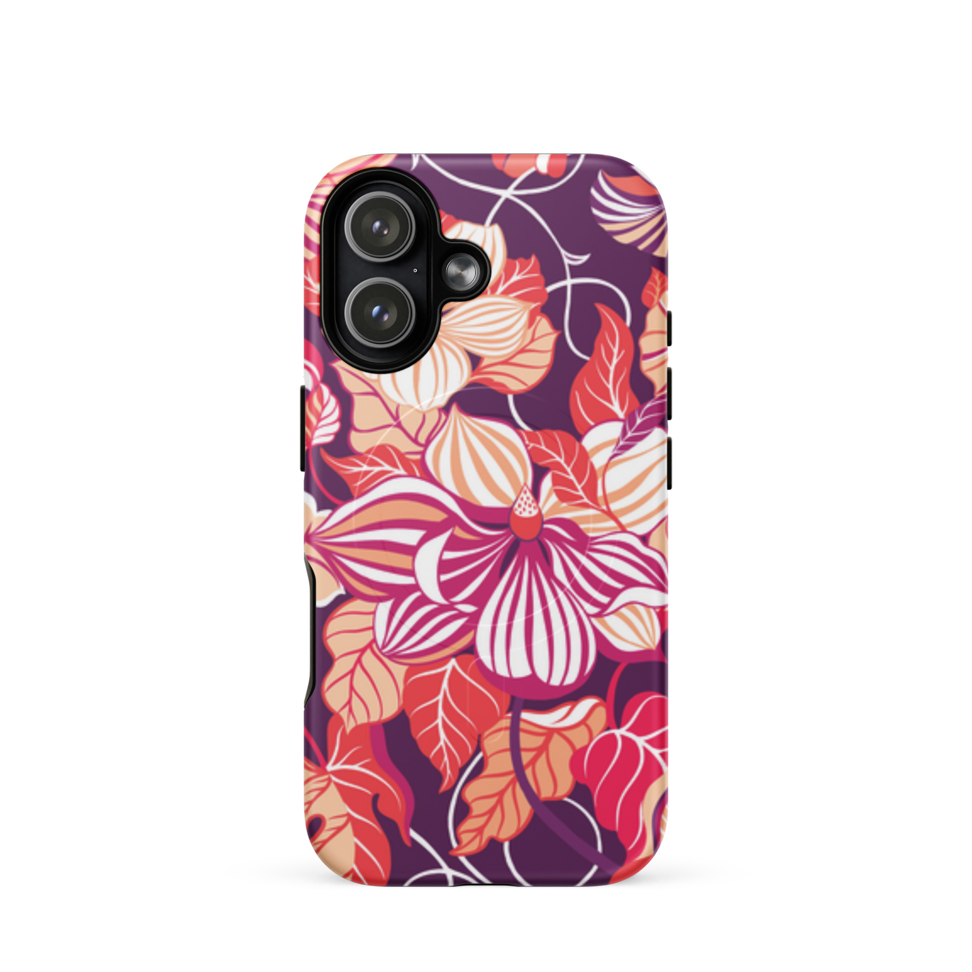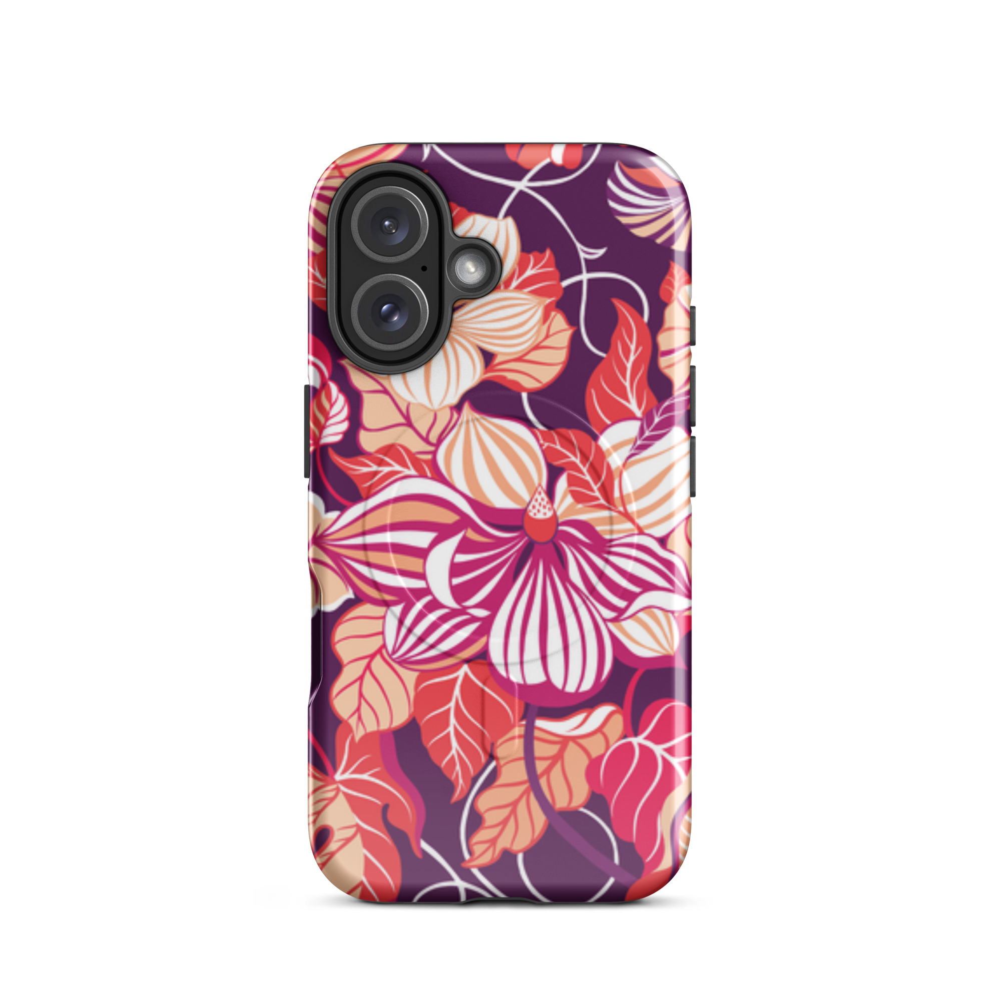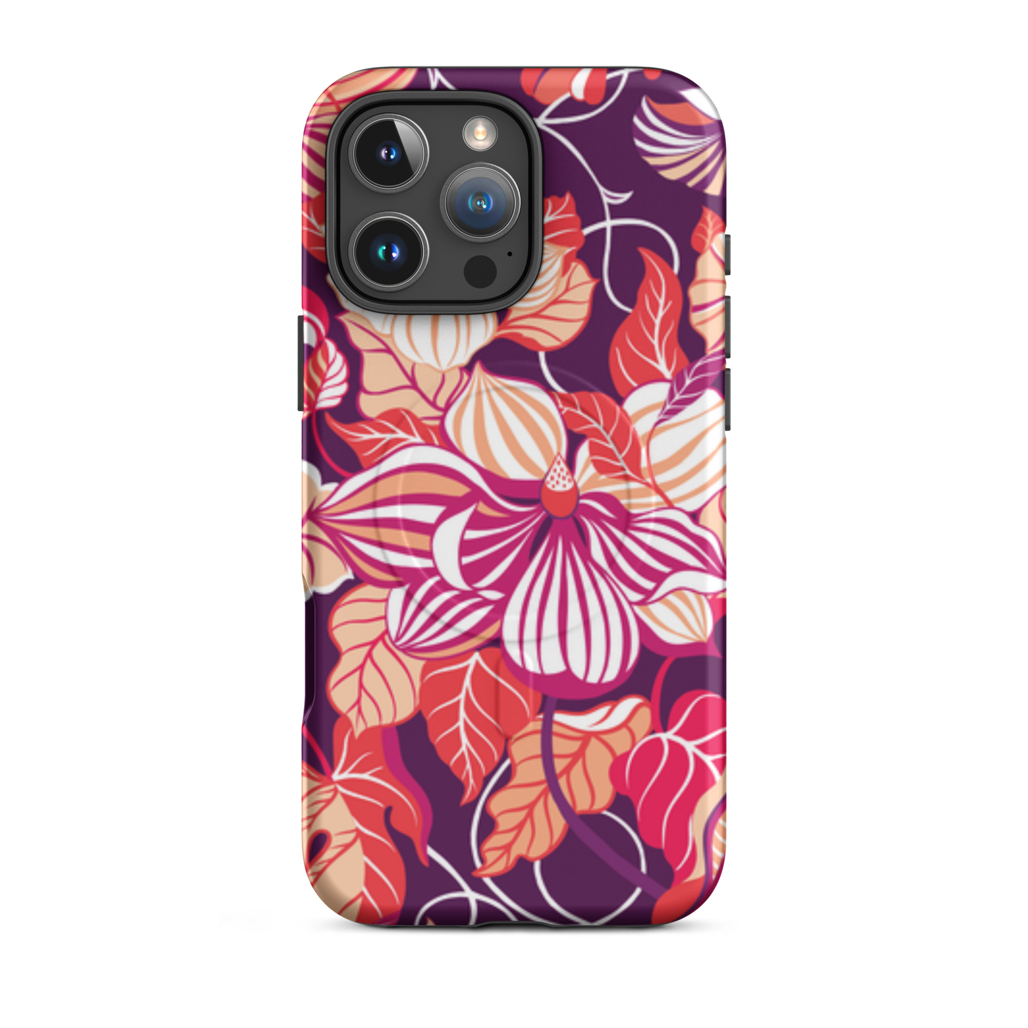 Capa para iPhone® MagSafe® - flores grandes e estilizadas em tons de vermelho, laranja, rosa e branco.