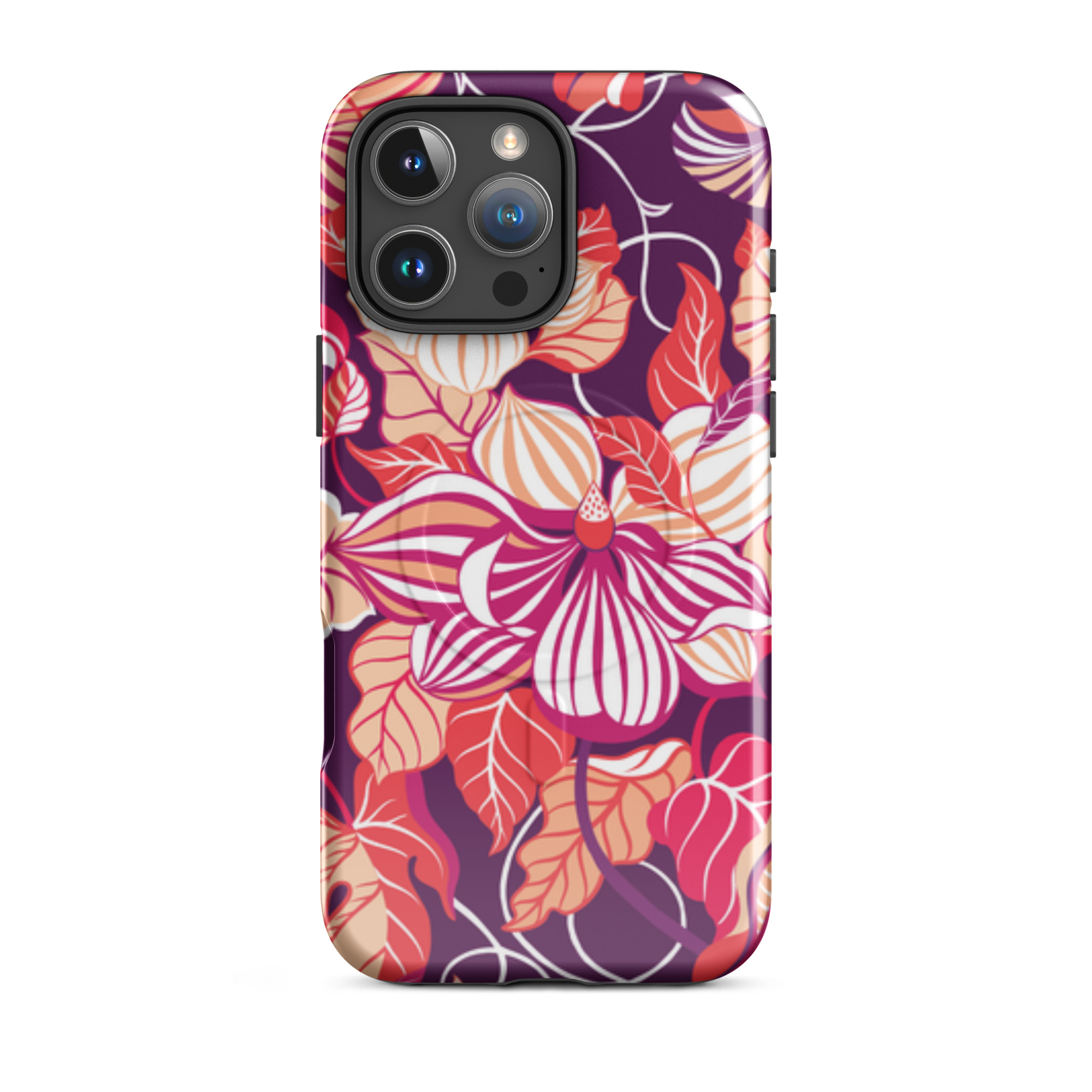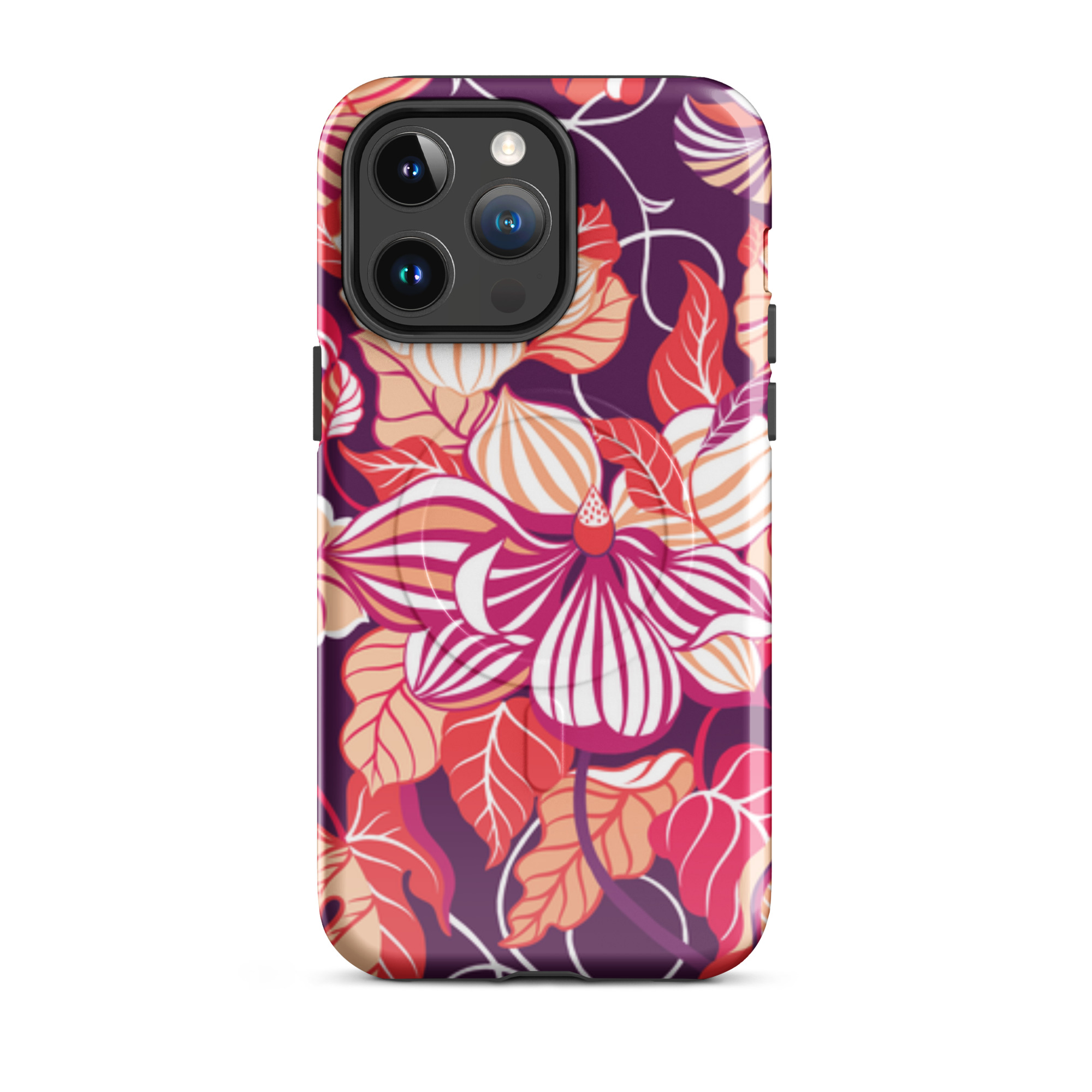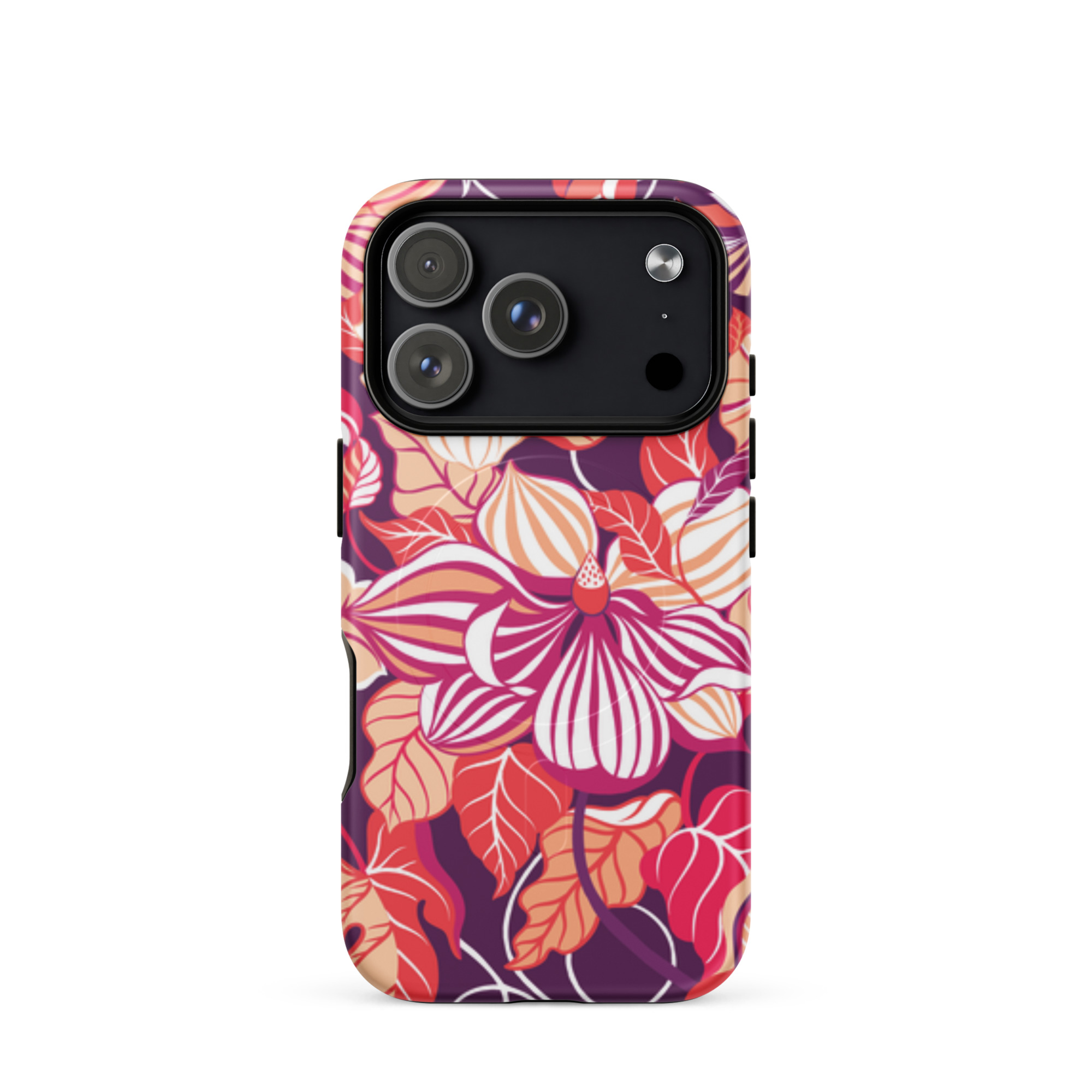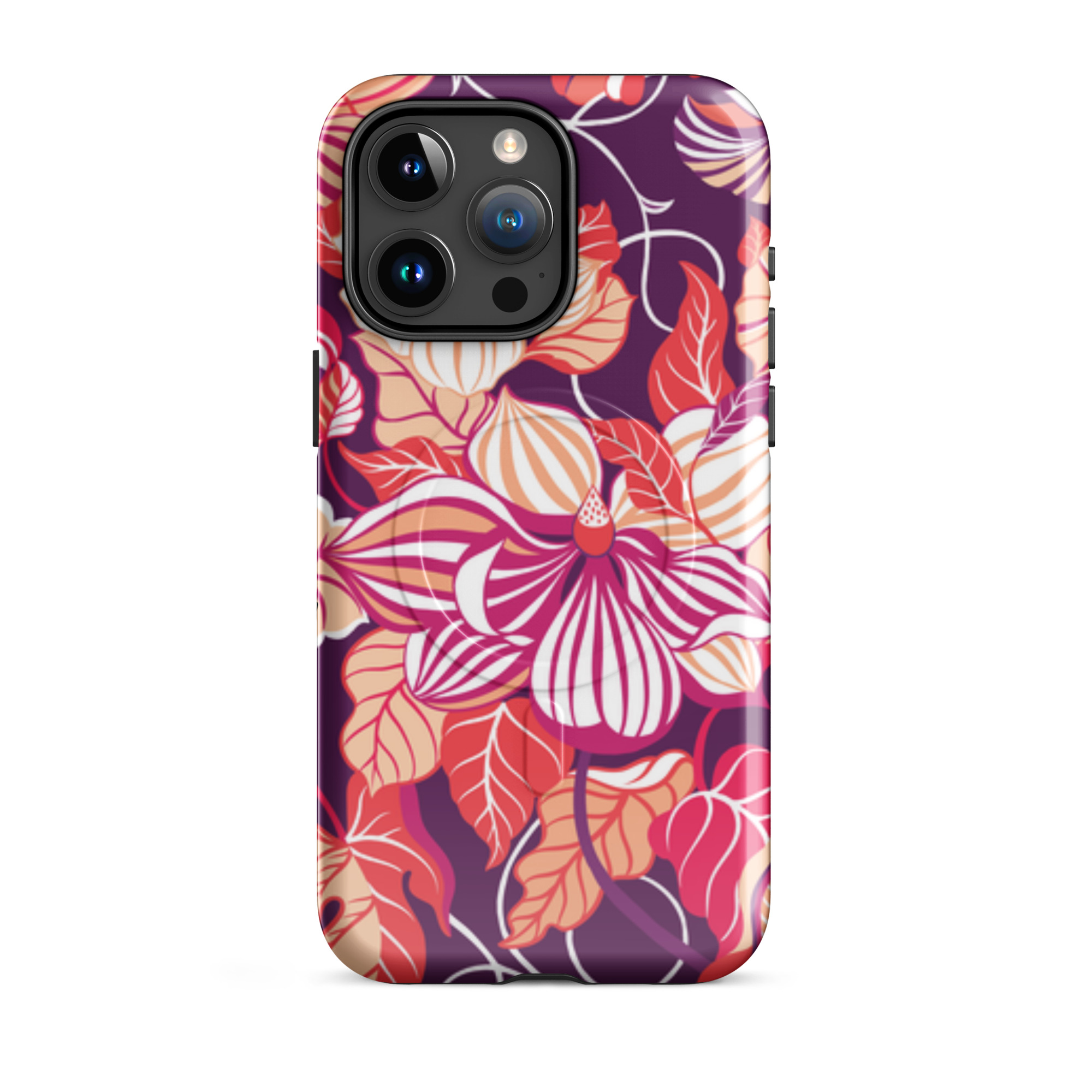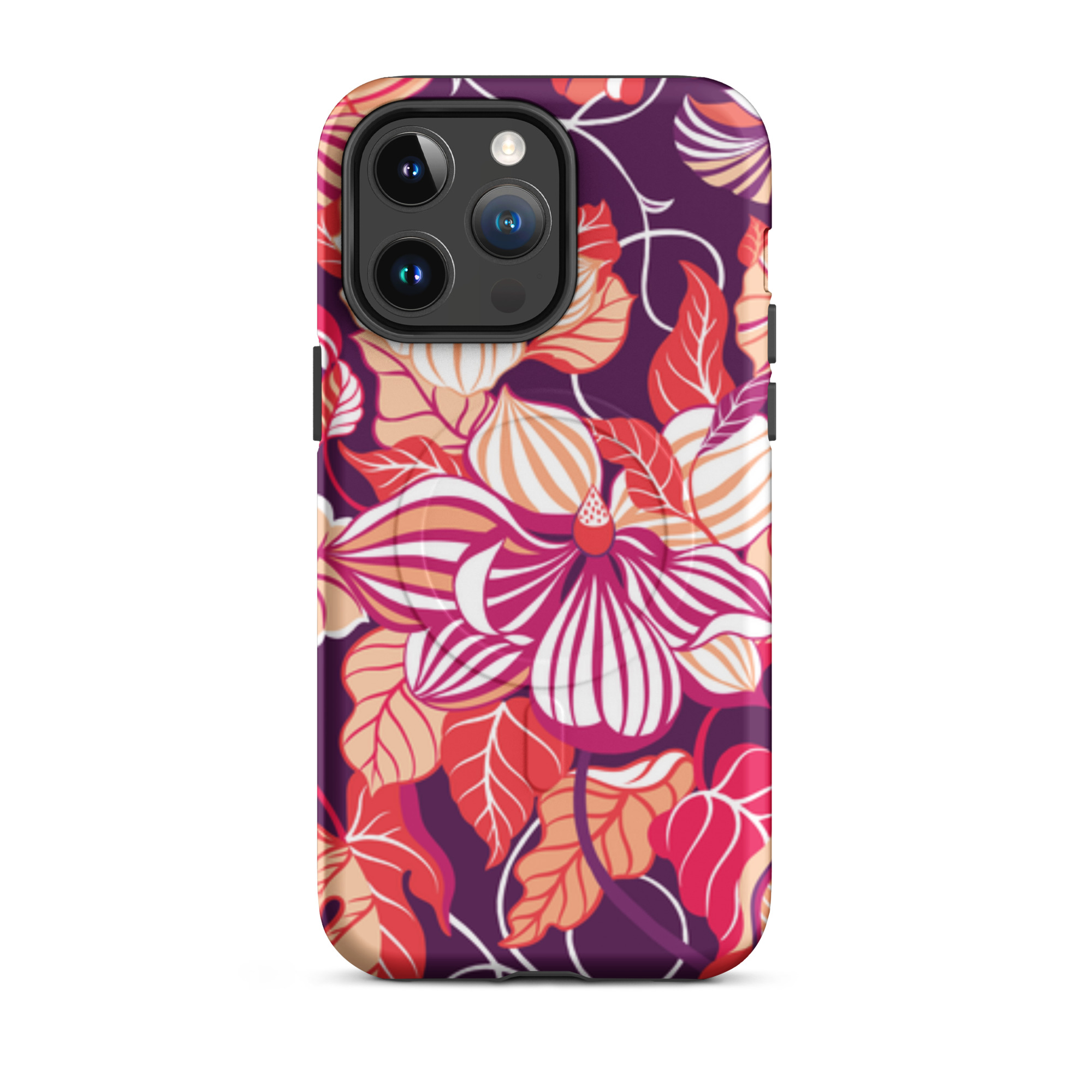 Capa para iPhone® MagSafe® - flores grandes e estilizadas em tons de vermelho, laranja, rosa e branco.