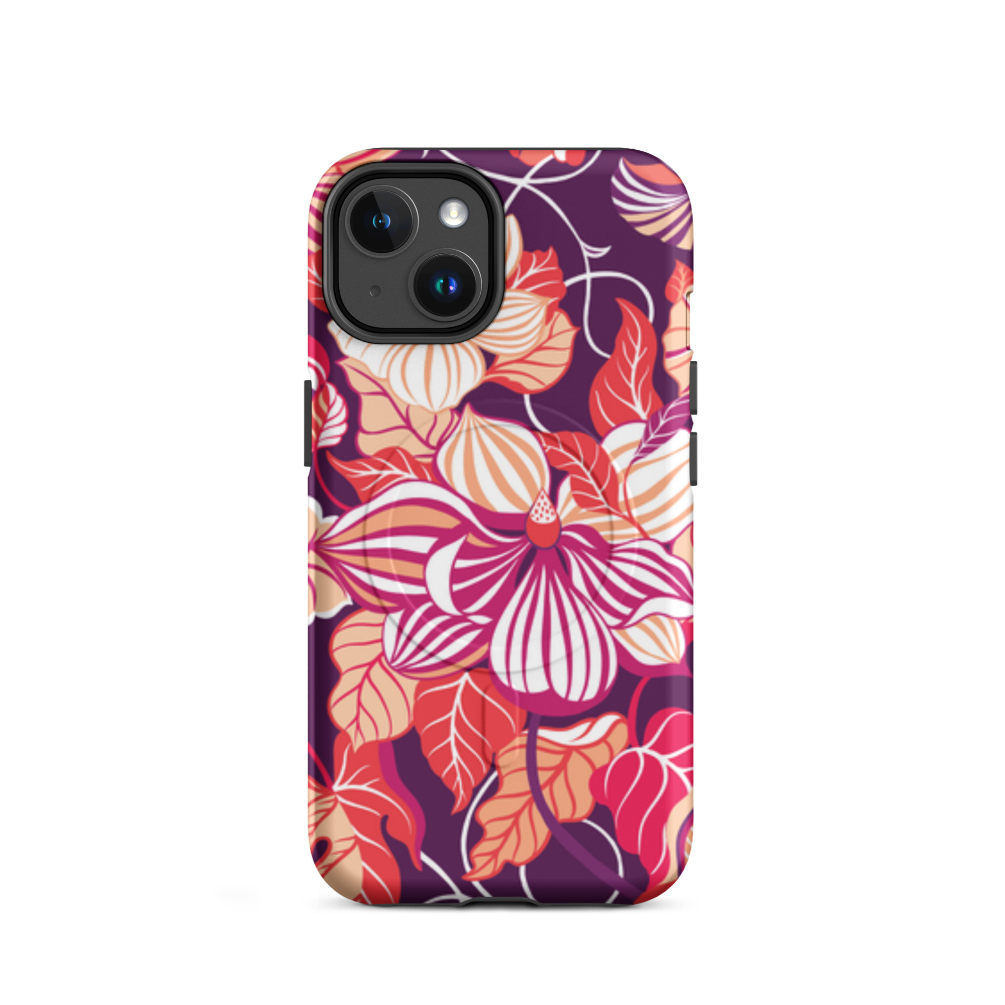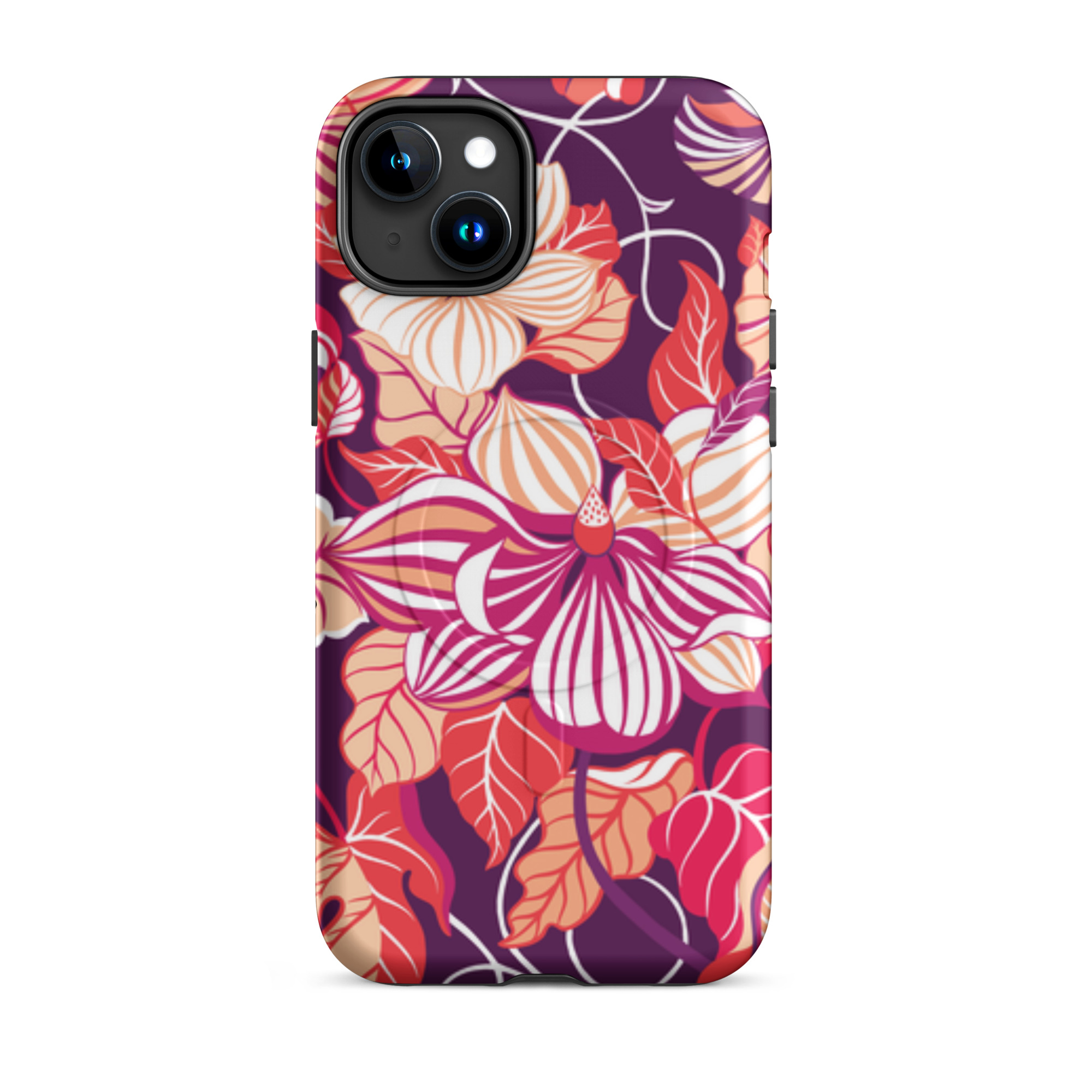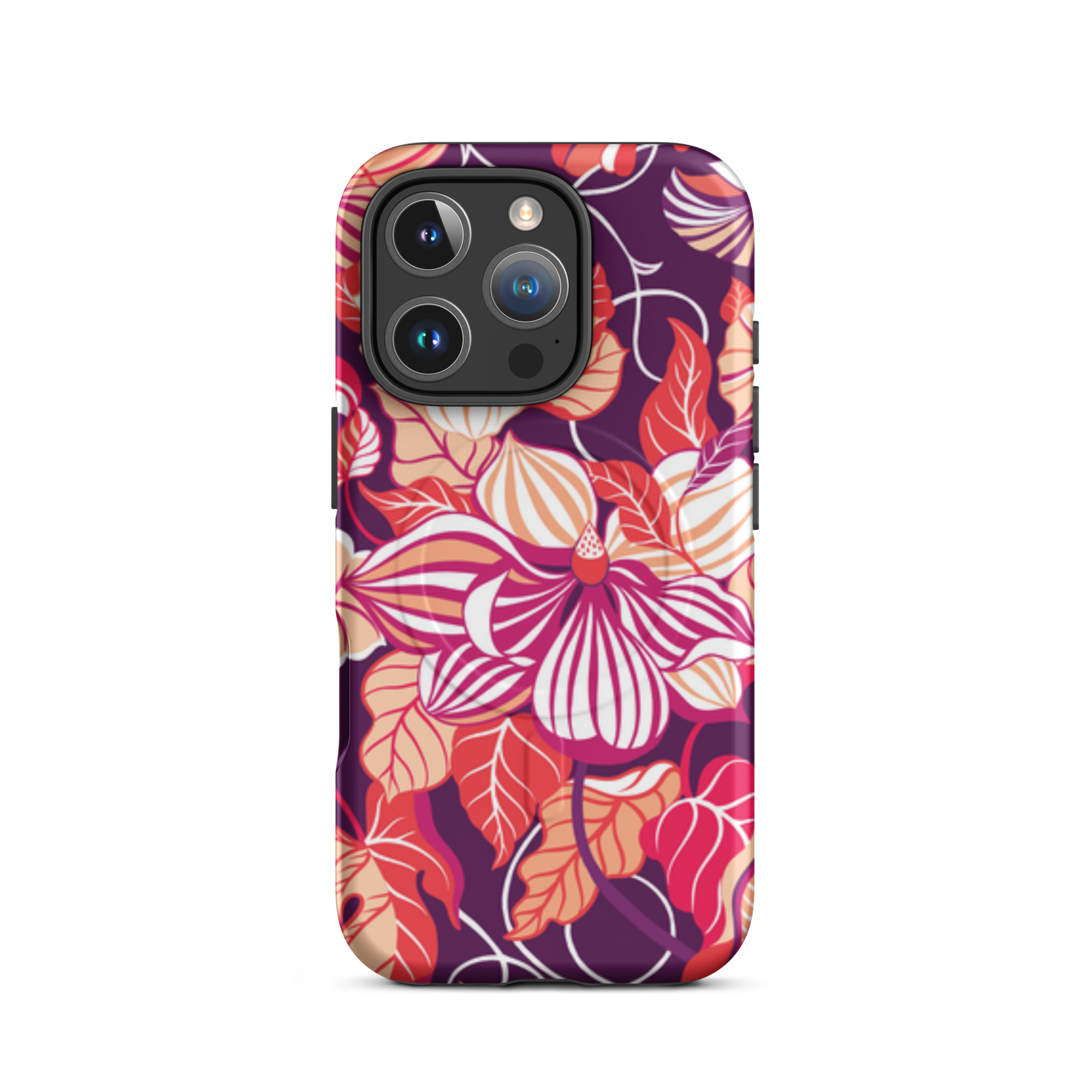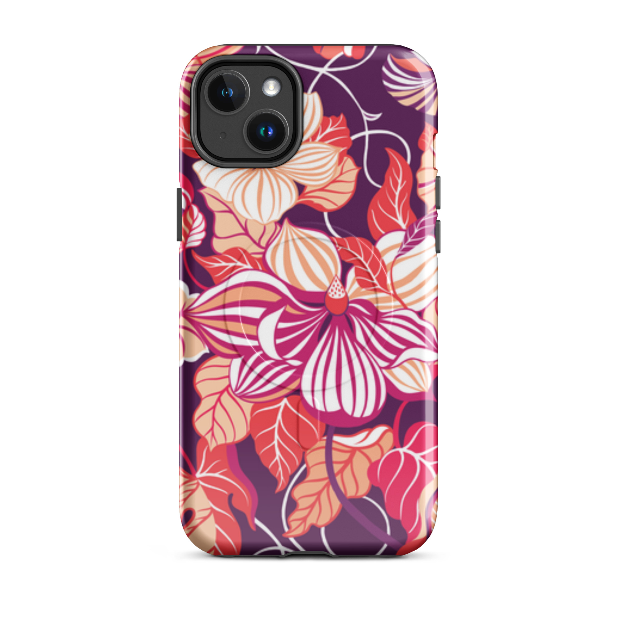 Capa para iPhone® MagSafe® - flores grandes e estilizadas em tons de vermelho, laranja, rosa e branco.
