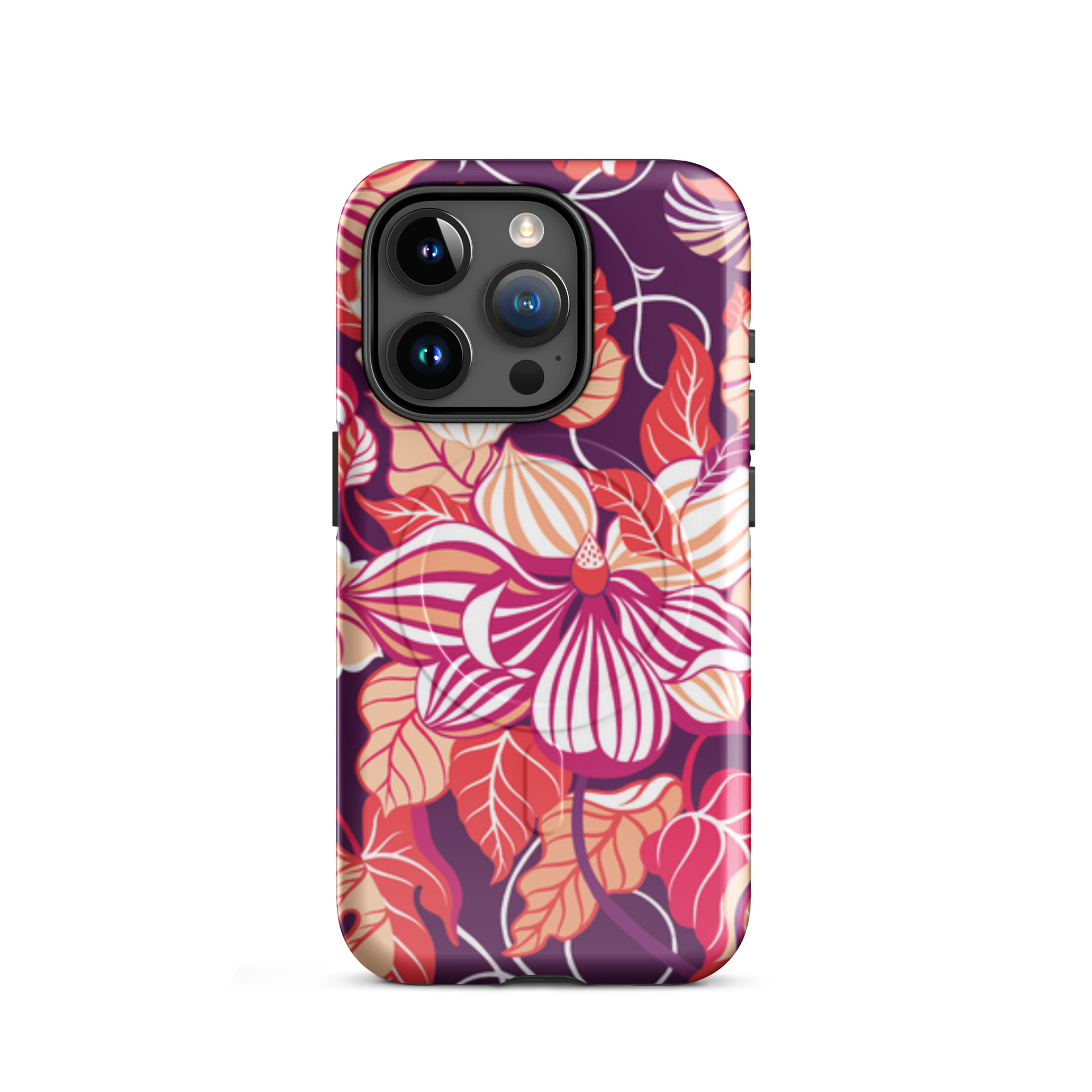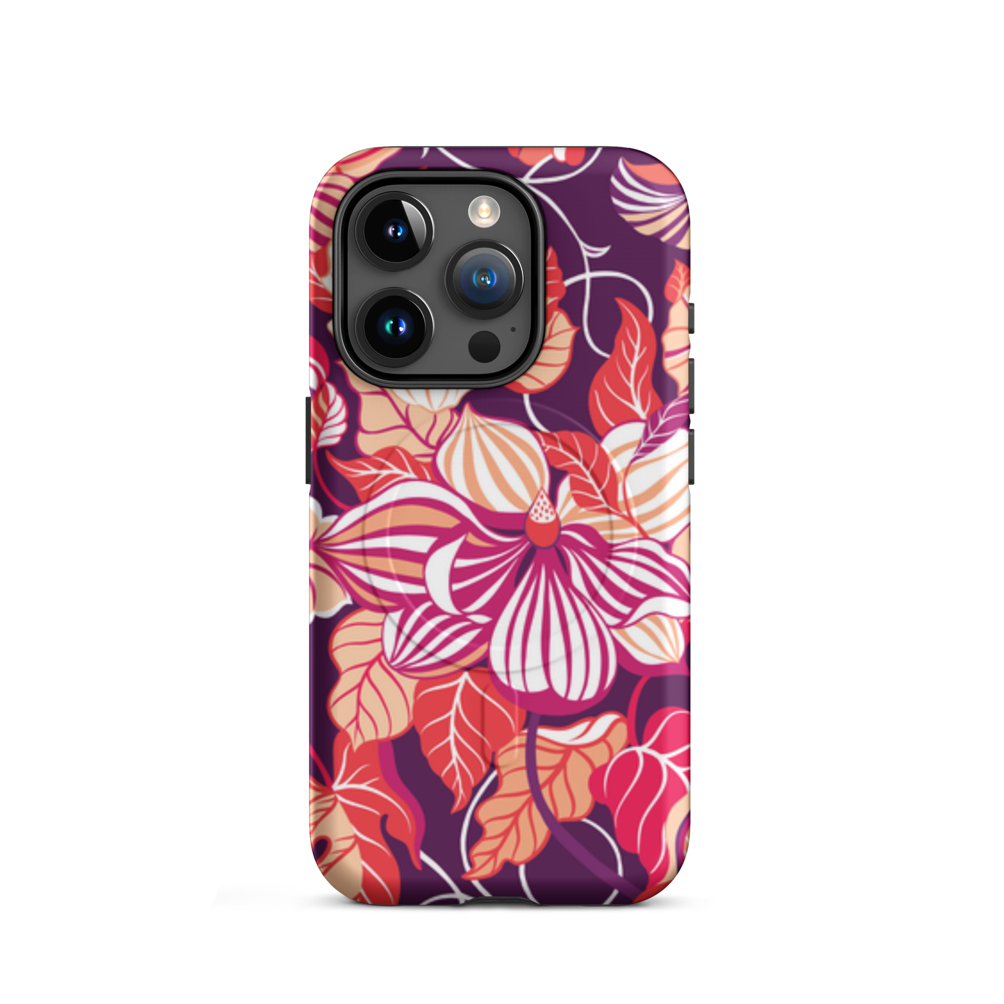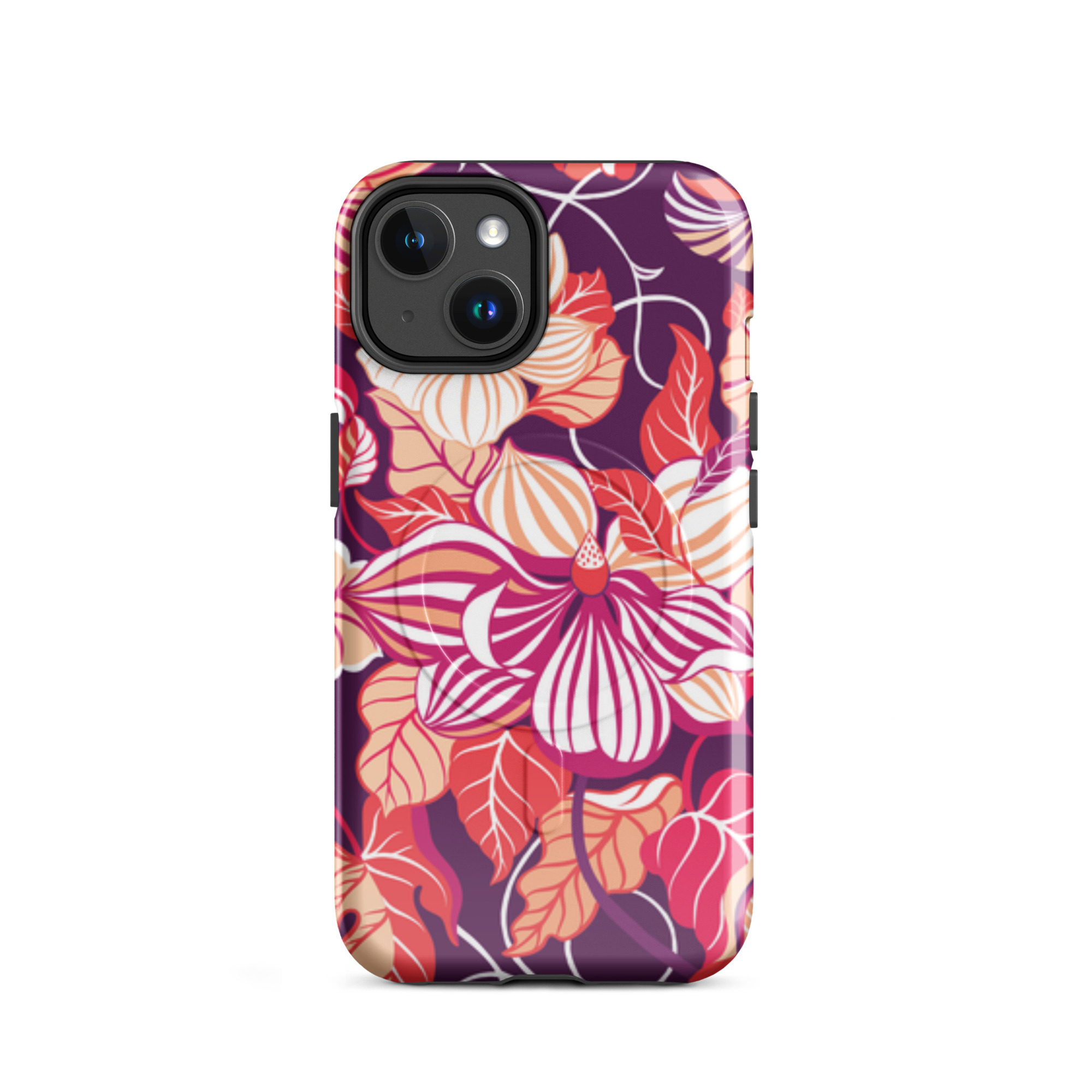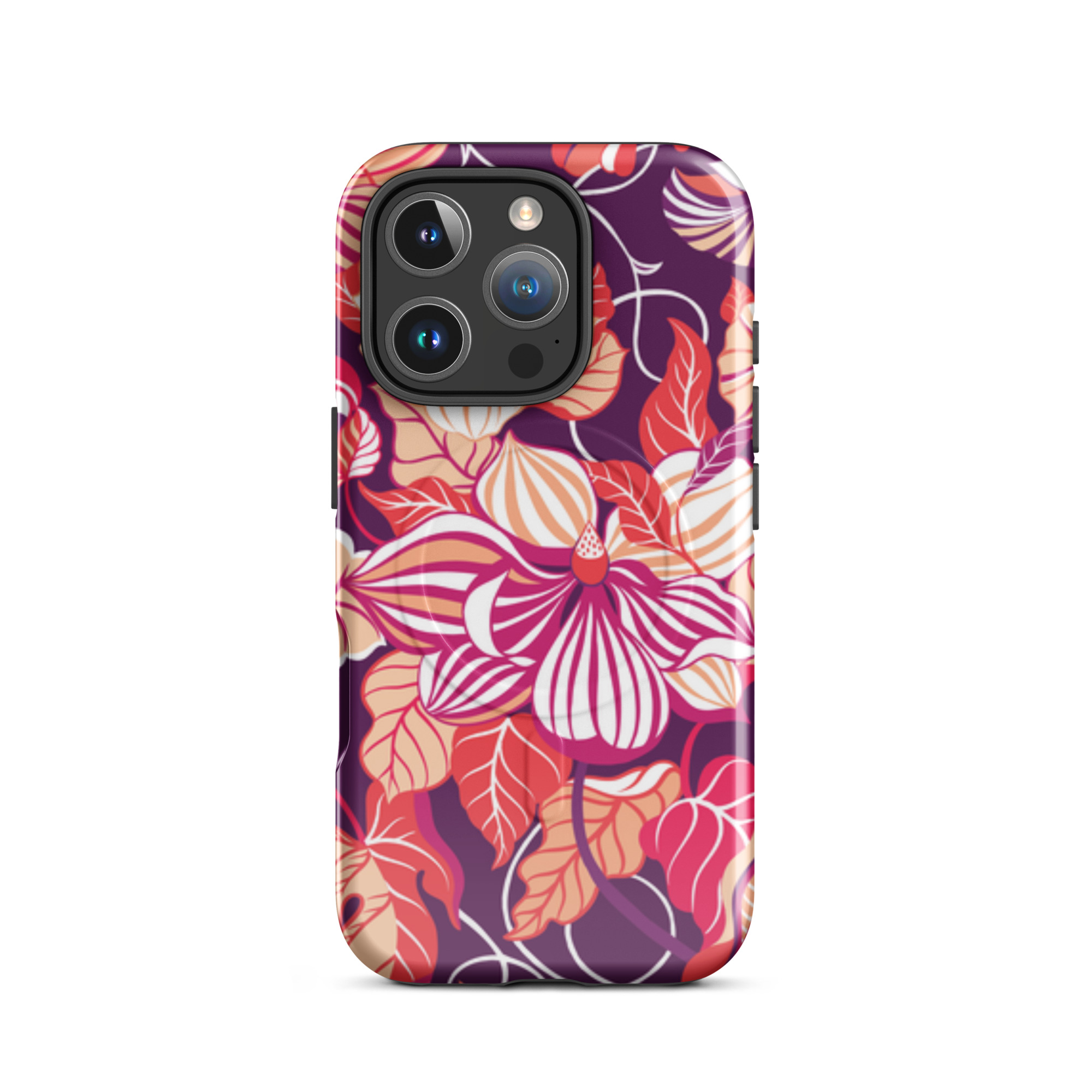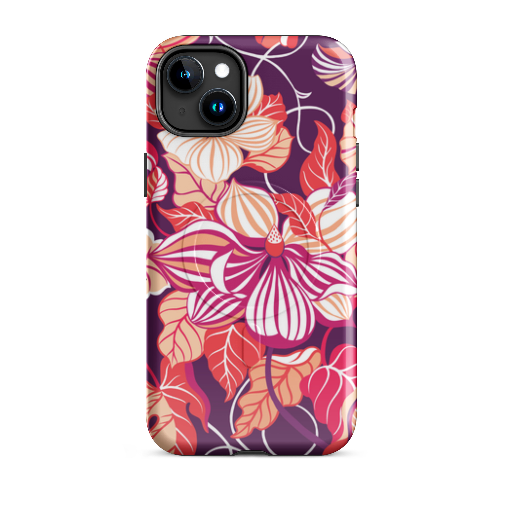 Capa para iPhone® MagSafe® - flores grandes e estilizadas em tons de vermelho, laranja, rosa e branco.