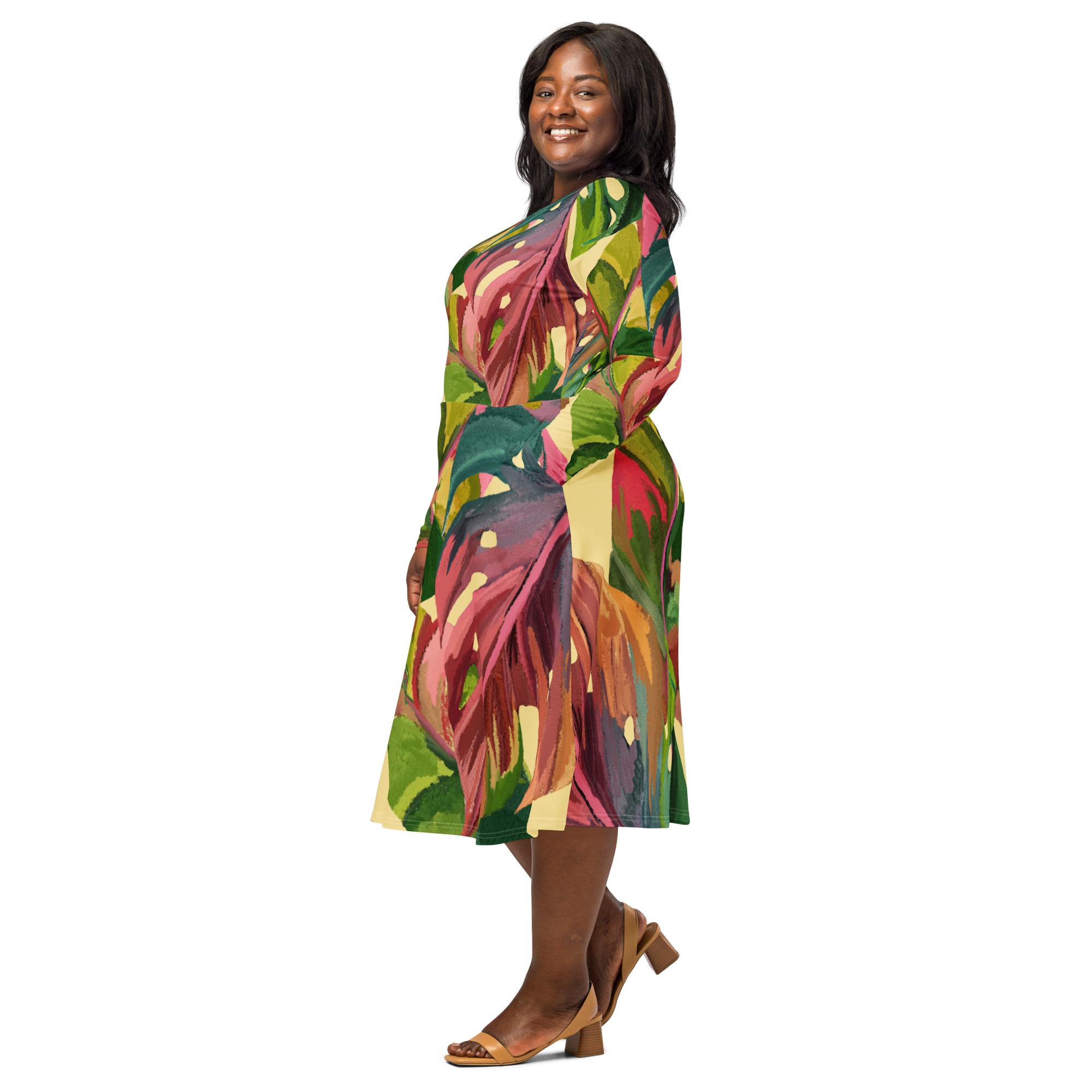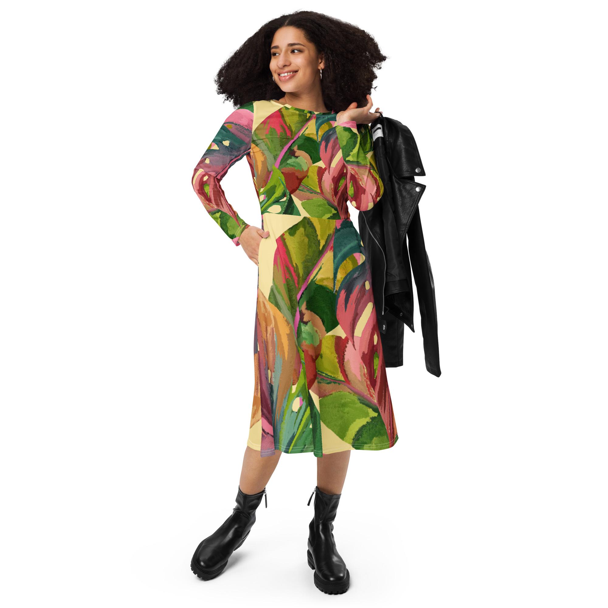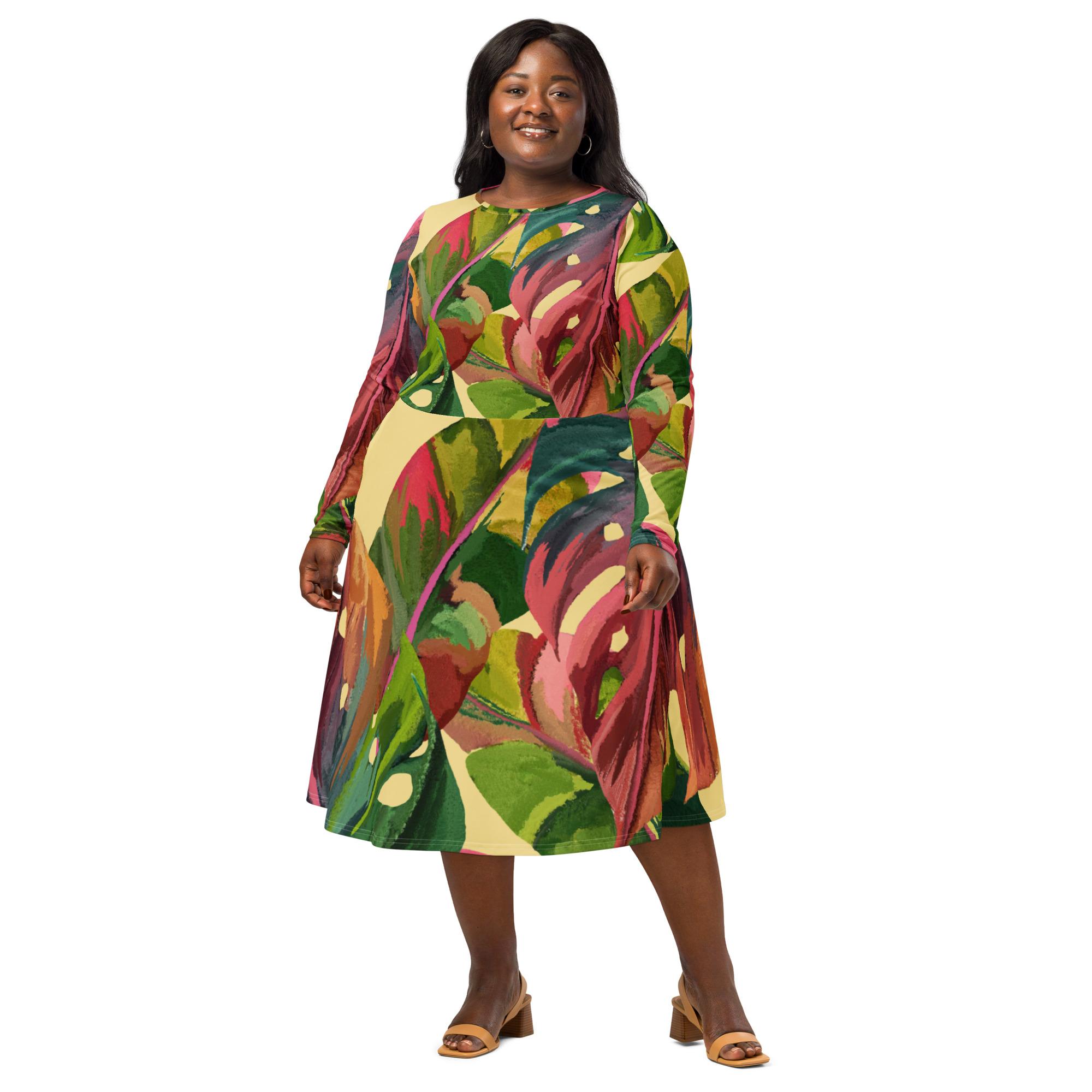 Vestido de manga comprida folhas coloridas