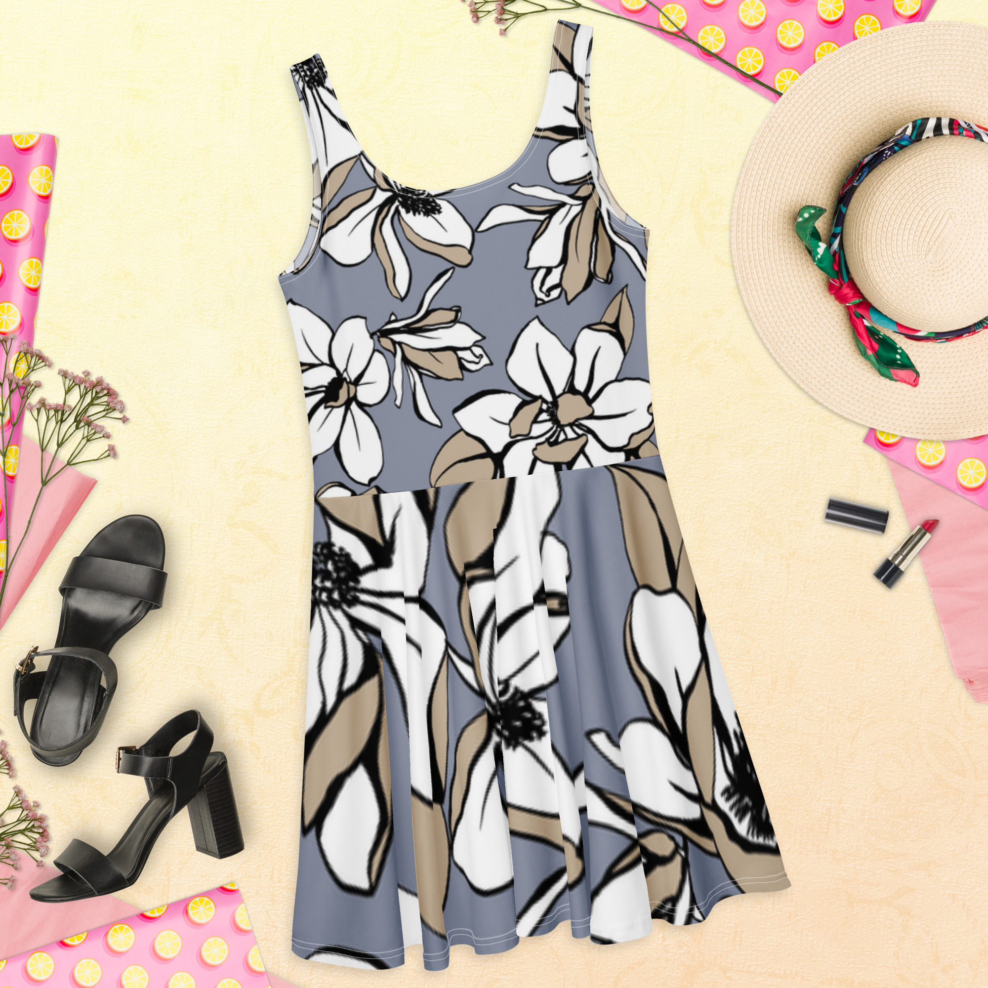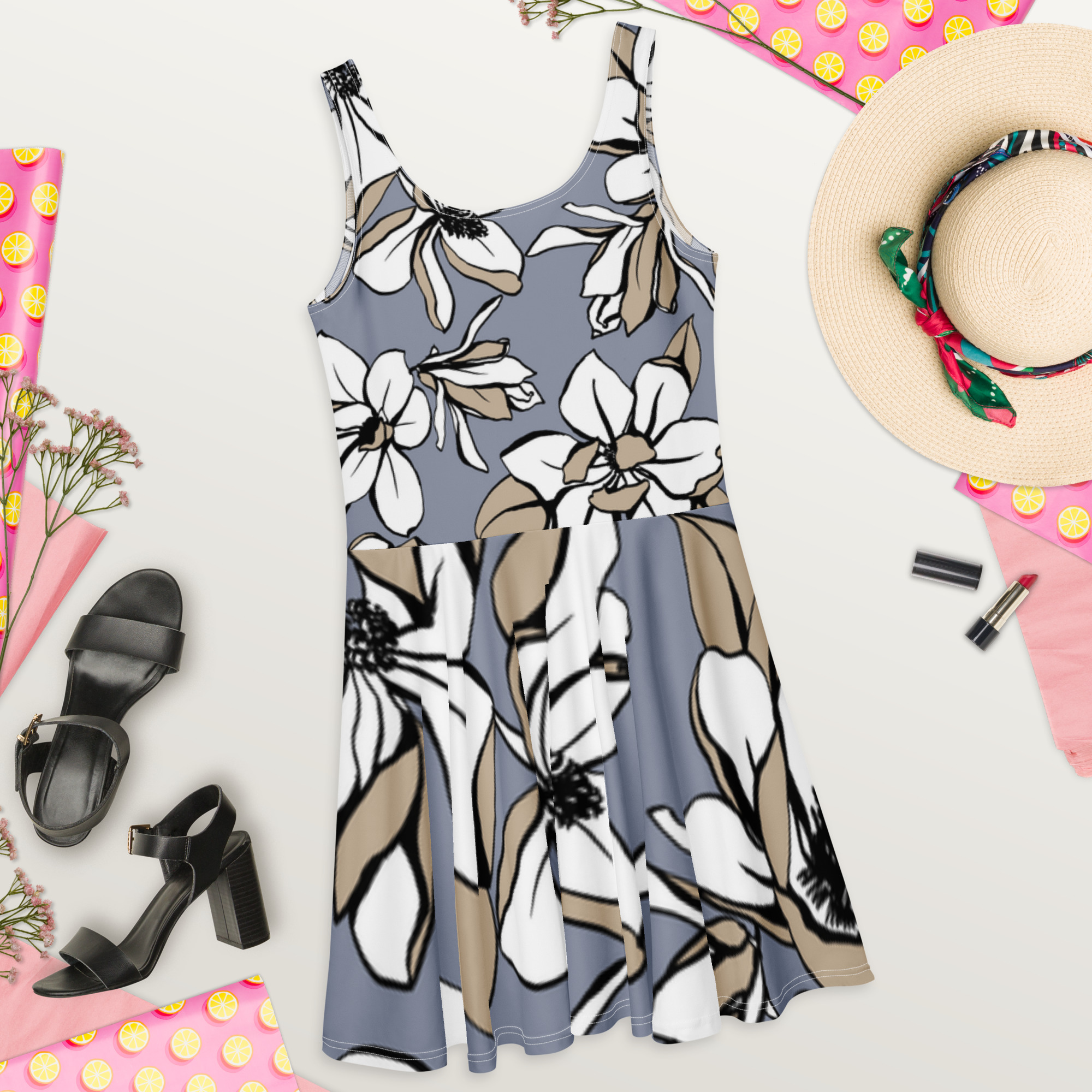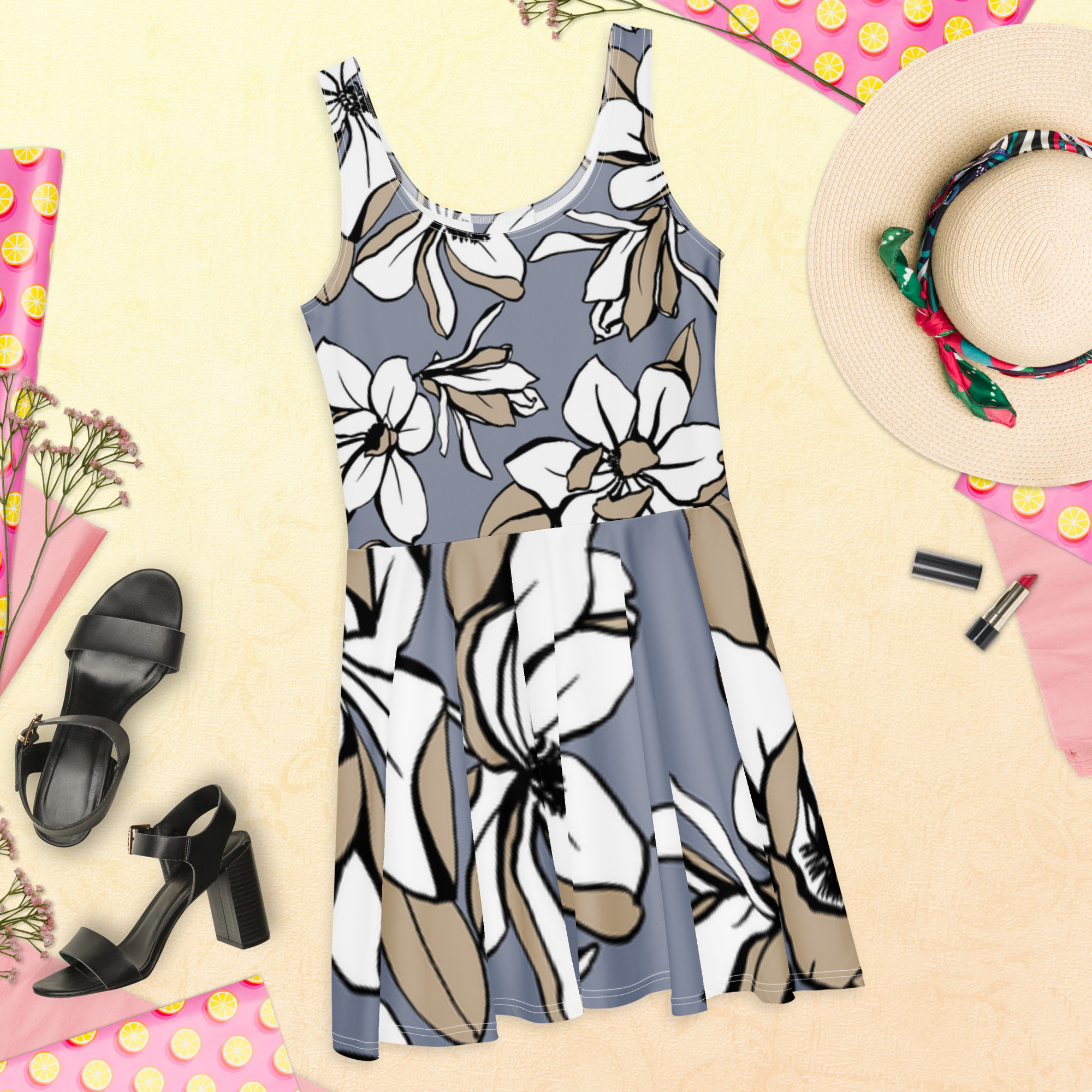 Você vai arrasar na pista com esse vestido skater sem manga! O tecido macio e o corte largo dão um toque elegante que realça o design detalhado com uma bela vibe.